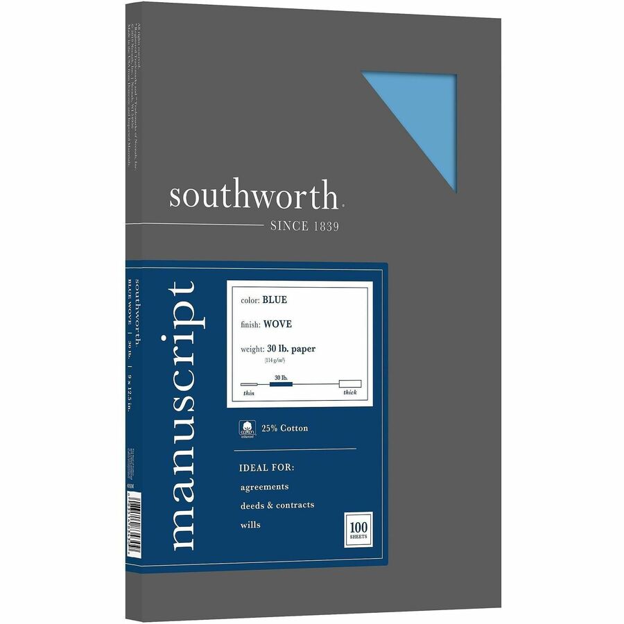 Manuscript covers protect legal briefs, scripts or similarly shared documents from wear and tear. 25 percent cotton fiber provides heavyweight protection. Tops are scored, and corners are clipped for folding and binding. Each 30 lb. manuscript cover features a watermark, smooth finish and an acid-free, lignin-free construction. Manuscript covers also contain a high percentage of recycled material. |