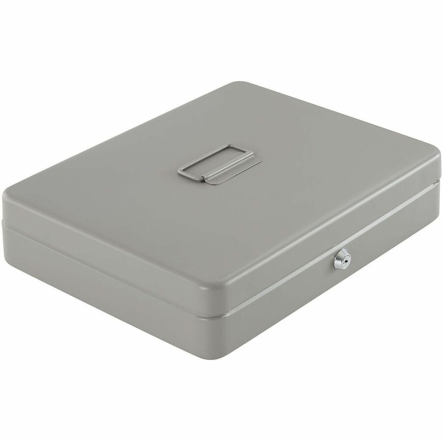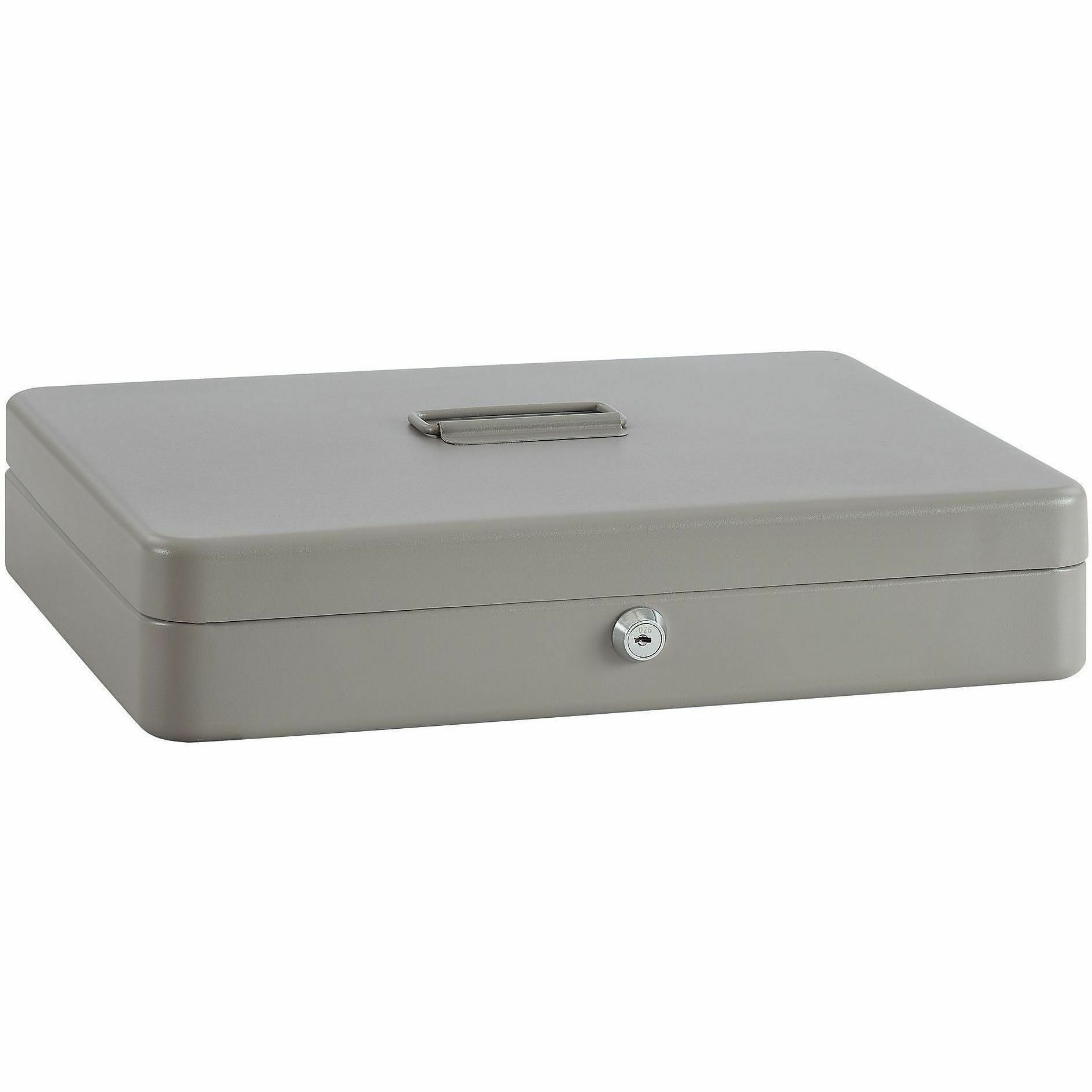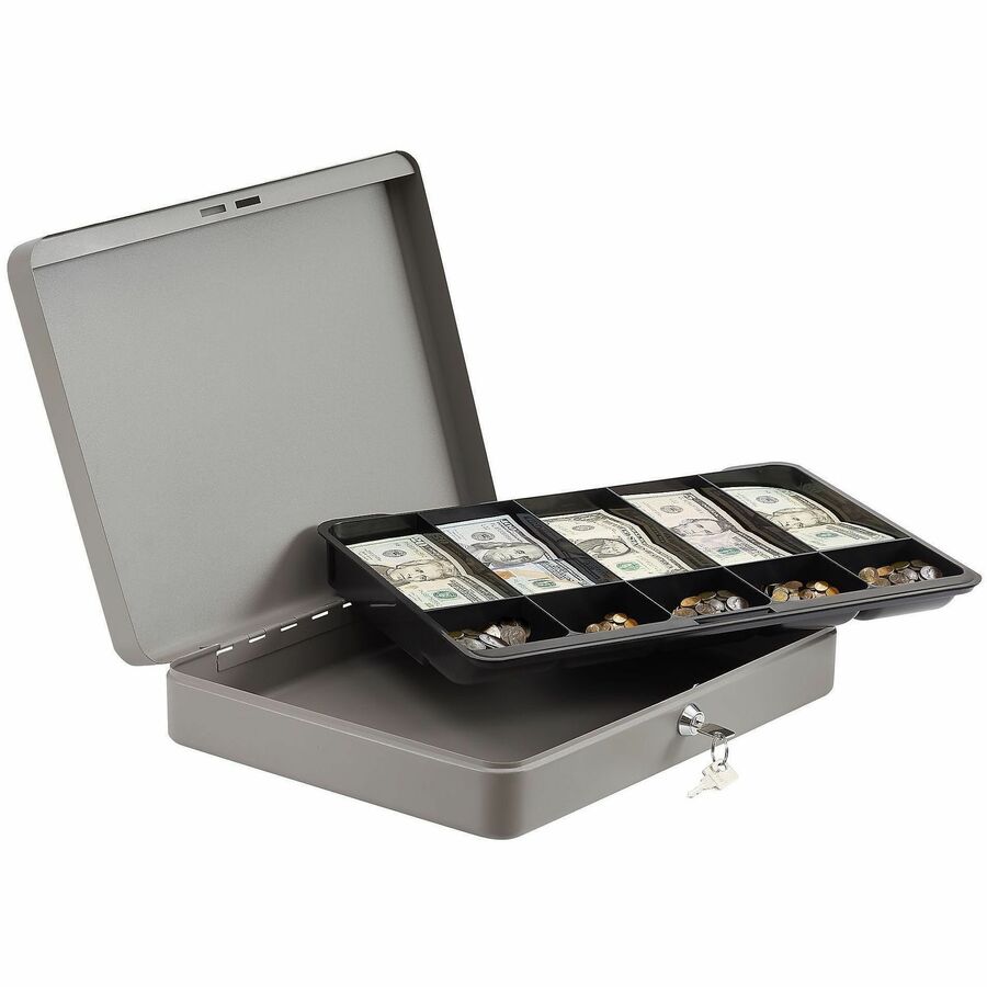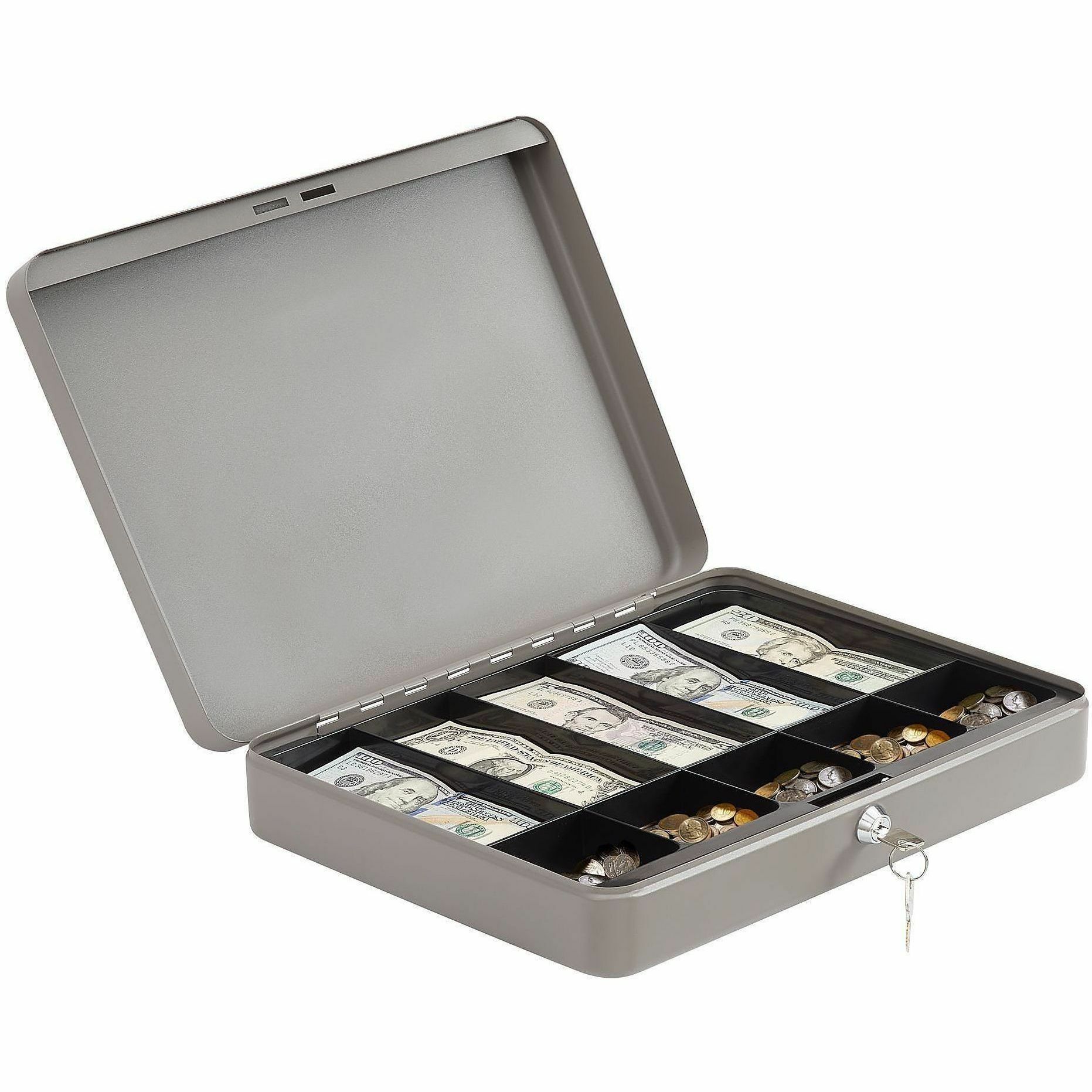 | Product Description | Cash box features a keylock and removable tray with 10 compartments to organize and safeguard your money and other valuables. Plastic tray has five long compartments for cash and five smaller compartments for coins. Steel construction of the box includes heavy-duty steel hinges. Cash box includes two keys. |