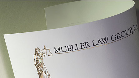 The Mueller Law Group's stationery specifications are 2 colors engraving requiring three production runs. The "lady justice" logo is one color gold metallic engraving and registered embossing on the engraved image, called, "burnishing," which gives the metallic engraving its enhanced and unique look. The text is 1 color black engraving. The final image results in the permanence and stature of a successful firm.
