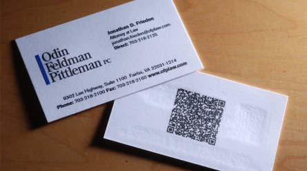 Odin Feldman Pittleman PC decided to feature QR codes on the back side of each attorney's business card. Each attorney had the option of a QR code that either links the user to the attorney's bio page on the firm's website or transfers the attorney's contact information into the smartphone.