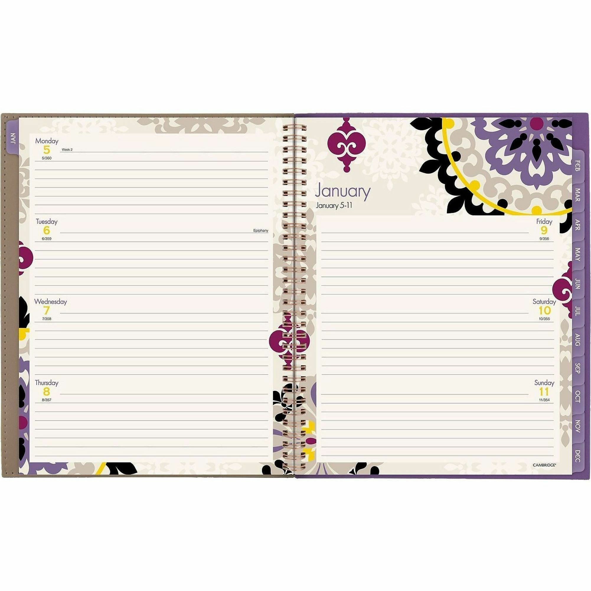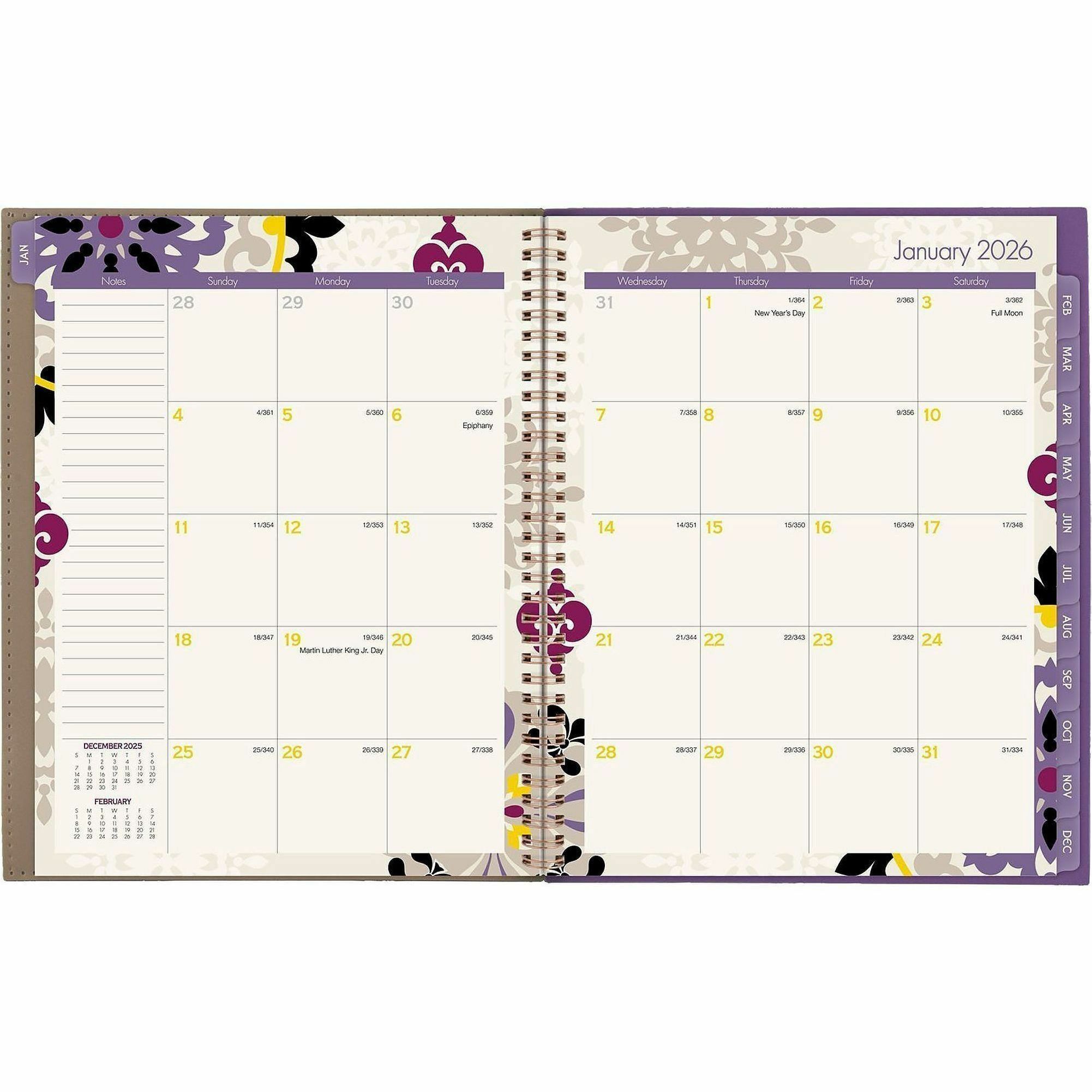 Small - Weekly, Monthly - 12 Month - January 2026 to December 2026 - 1 Week, 1 Month Double Page Layout - 8 1/2" x 11" Sheet Size - White Sheet - Wire Bound - Brown, Purple, Yellow - Poly - Tabbed, Reference Calendar, Contact Sheet, Notes Area, Pocket, Ruled Daily Block, Unruled Daily Block - 1 Each
