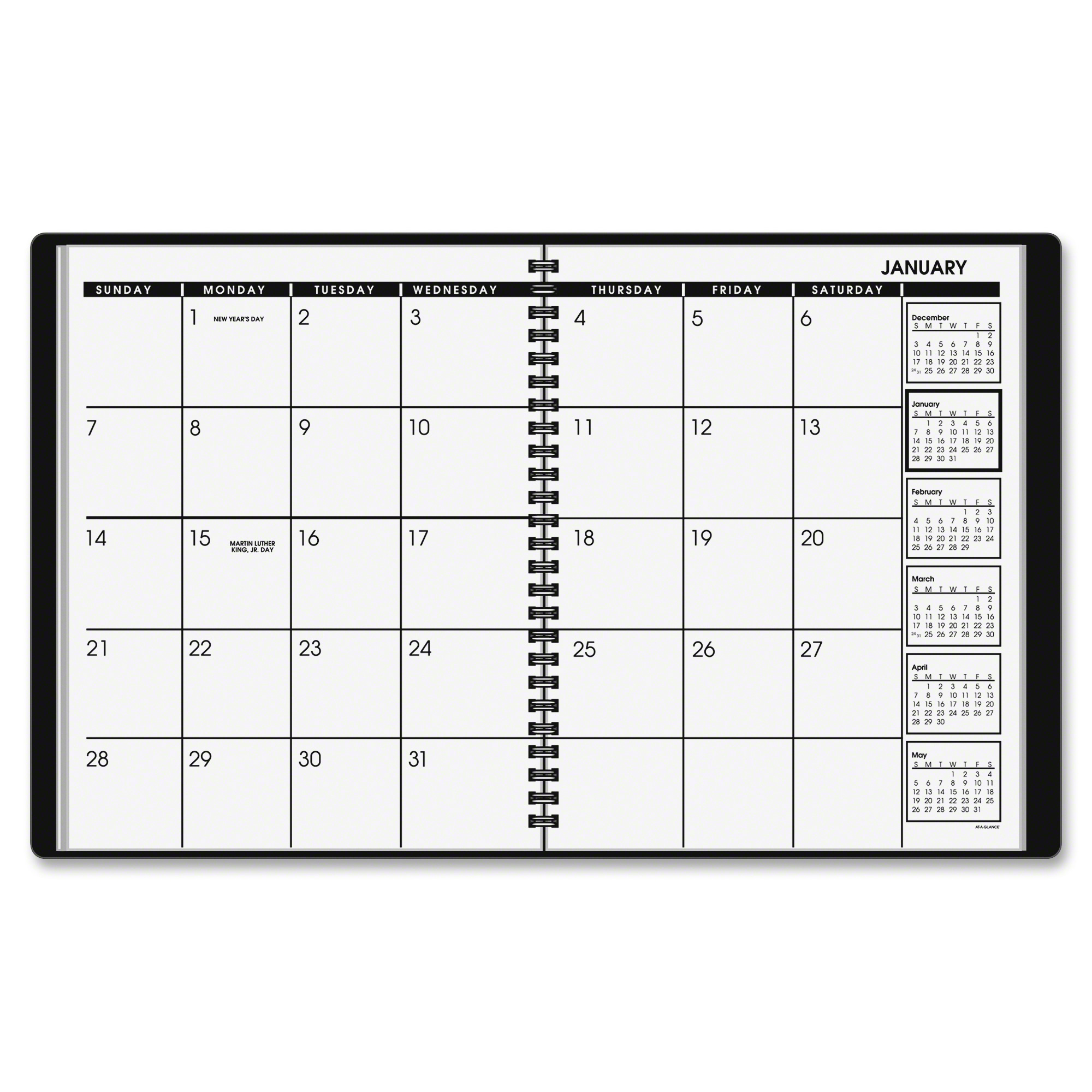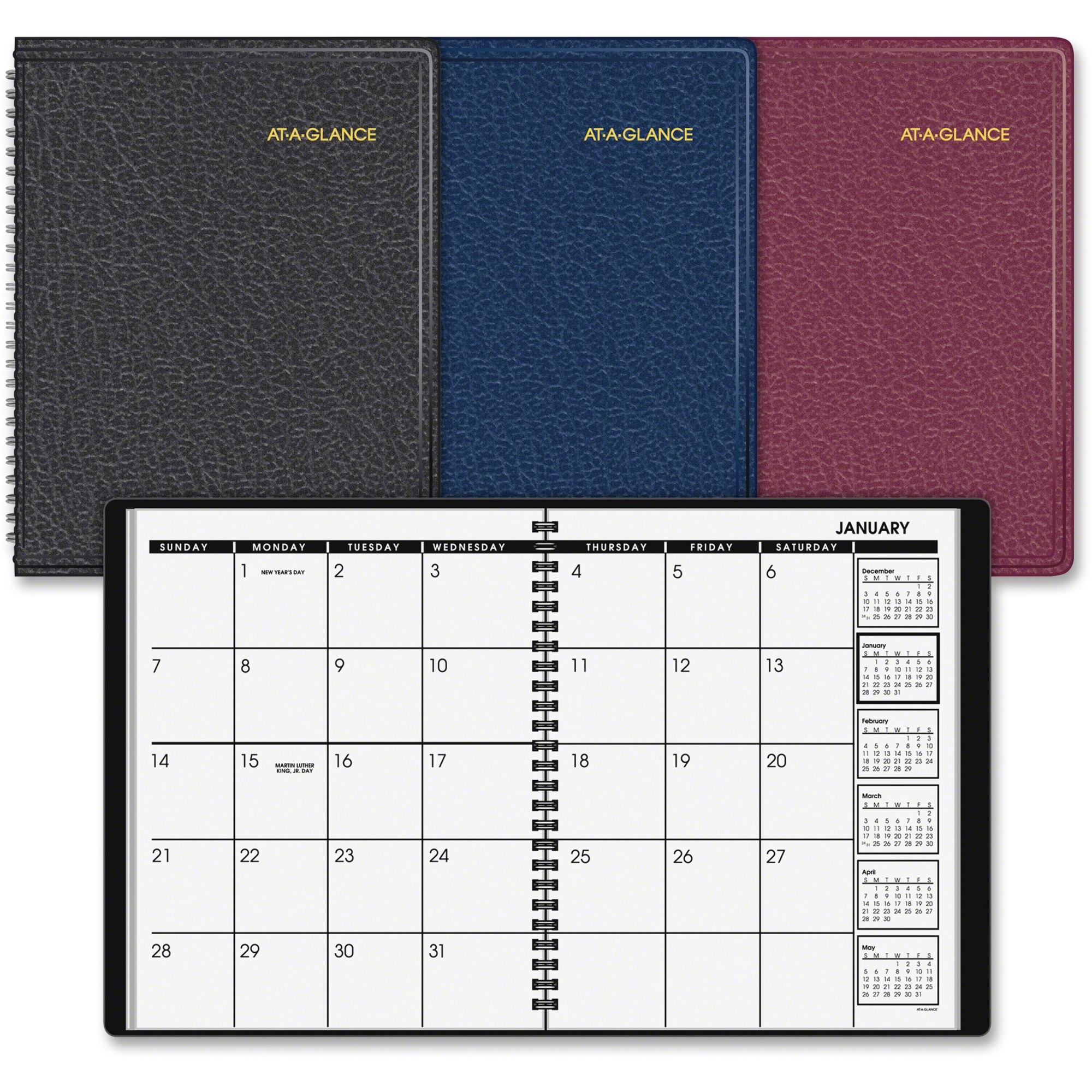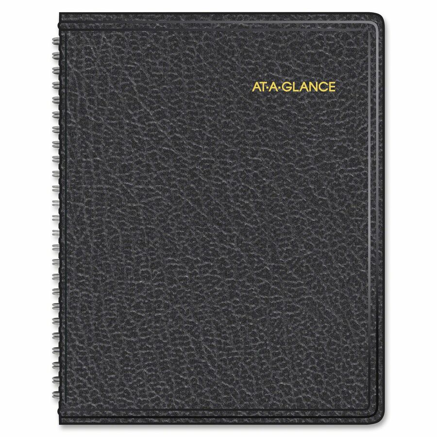 Monthly planning is easy to organize with this classic appointment book. Dated planning pages range 12 months from January to December. Two-page-per-month spreads offer unruled daily blocks, Sunday-through-Saturday scheduling, holidays, and past, current and four future months reference. The current reference month is highlighted with a box for quick identification. Wirebound planner also features a simulated leather cover, telephone/address page and perforated memo section. |