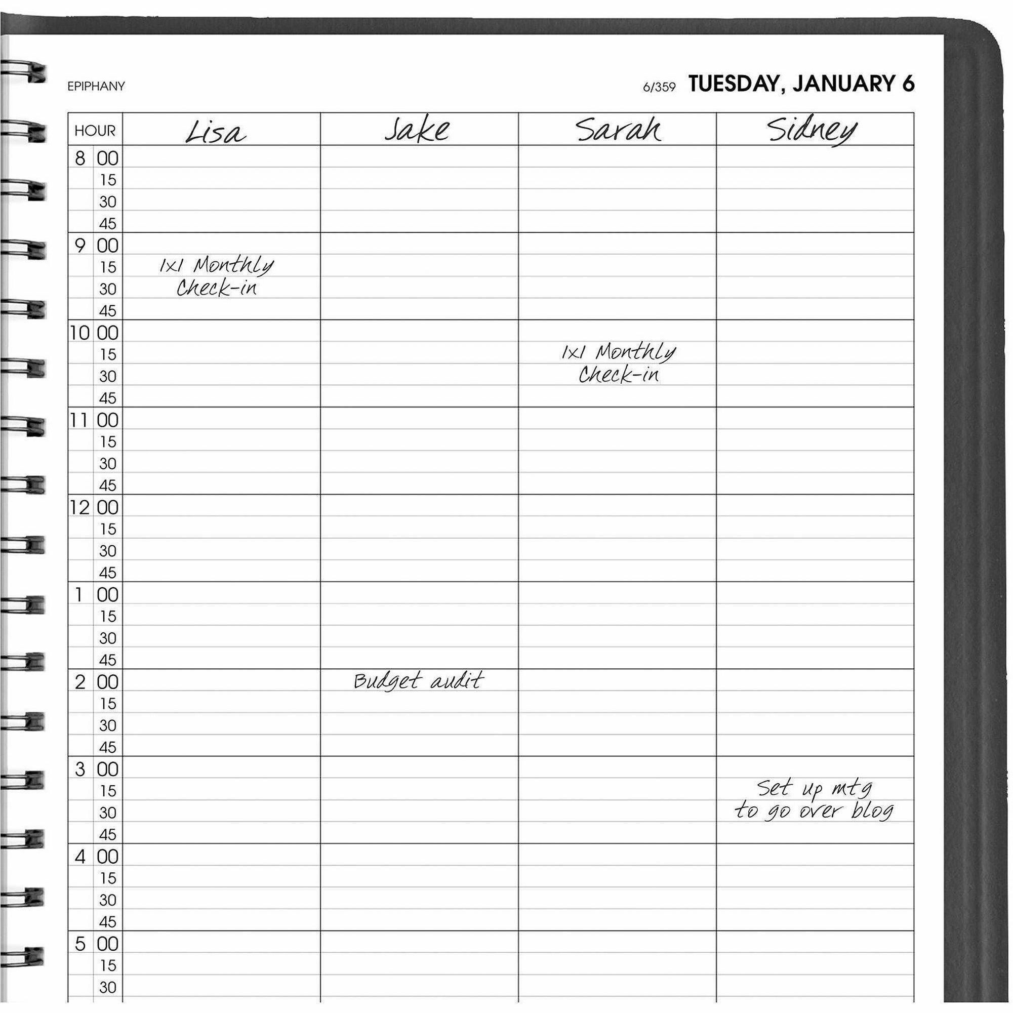 | Product Description | Four-Person Daily Appointment Book allows you to keep track of four people's schedules at one time. Ideal for small work groups or contract workers. Dated planning pages range 12 months from January to December. One-page-per-day format includes quarter-hourly appointment times from 8 AM to 7 PM (Monday through Saturday) in four columns for professional group appointments, count of days/days remaining and a ruled note section for each column. Wirebound appointment book also offers perforated corners for easy reference and a simulated leather cover to protect your planning pages. Pages are printed in green ink on quality paper. |