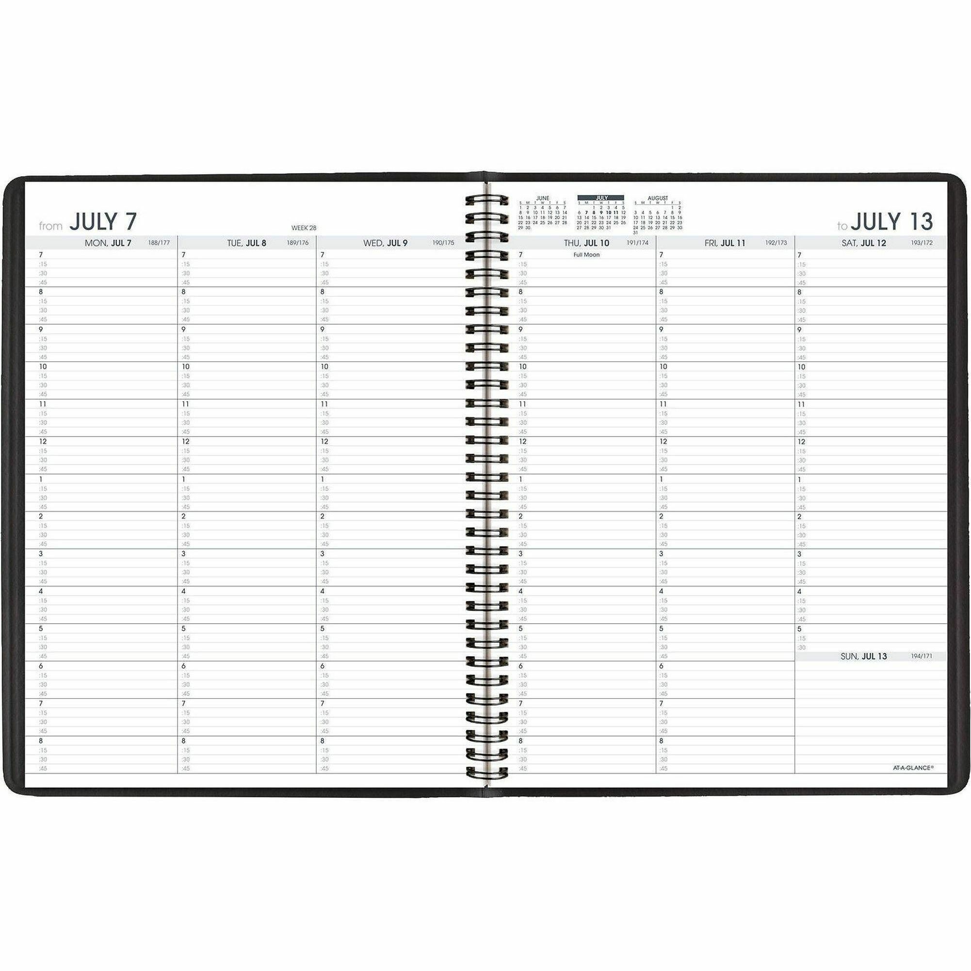 Julian Dates - Weekly - 14 Month - July 2025 to August 2026 - 7:00 AM to 8:45 PM - Quarter-hourly, 7:00 AM to 5:30 PM - Quarter-hourly - 1 Week Double Page Layout - 8 1/4" x 10 7/8" Sheet Size - Wire Bound - Black - Simulated Leather - 1 Each