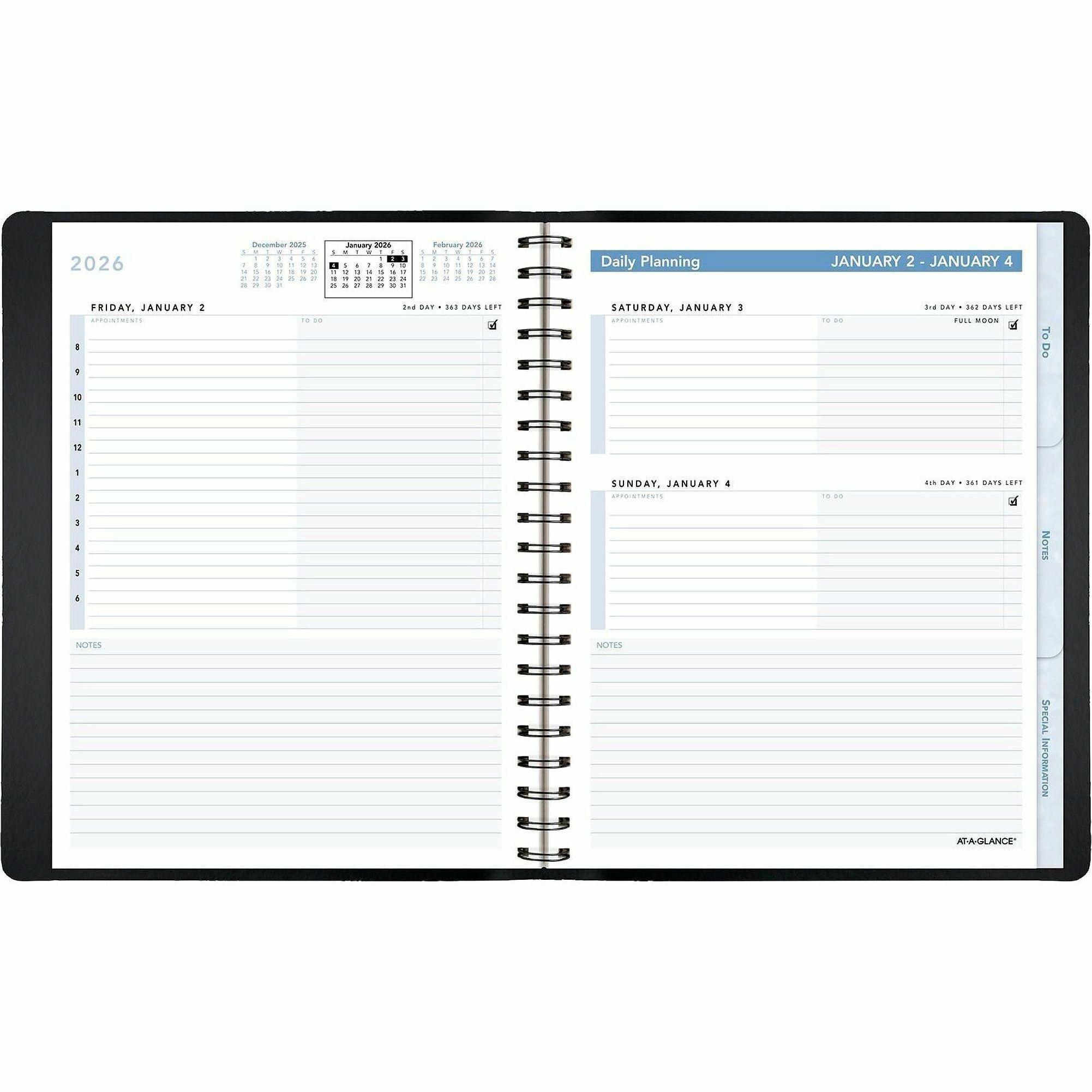 Medium - Julian Dates - Daily - 1 Year - January 2026 to December 2026 - 8:00 AM to 6:00 PM - Hourly - 1 Day Single Page Layout - 6 1/2" x 8 3/4" Sheet Size - White Sheet - Wire Bound - Black - Simulated Leather, Faux Leather - Pocket, Tabbed, Ruled - 1 Each