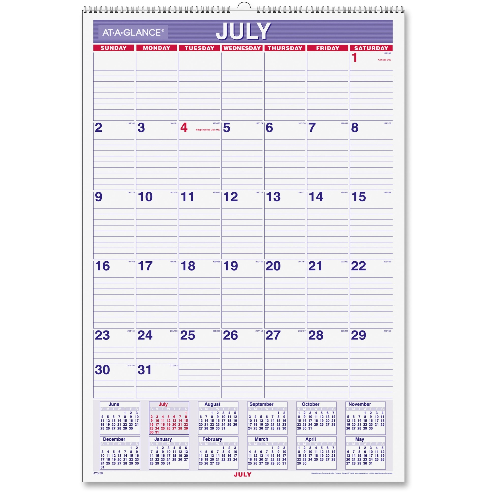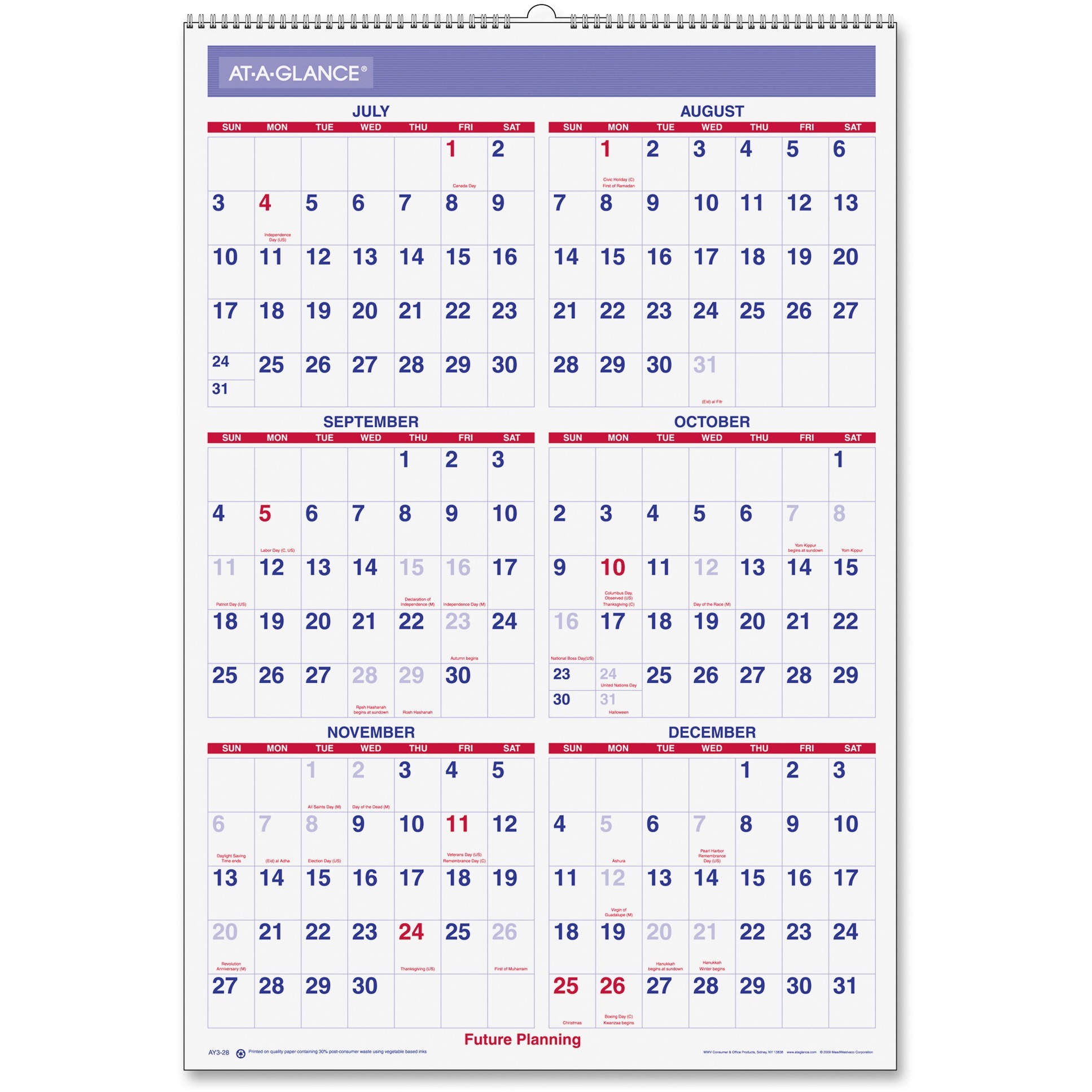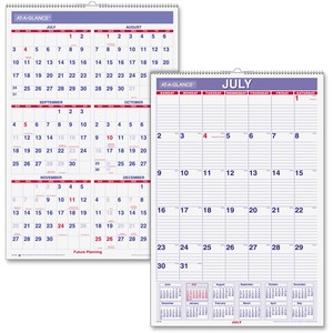 Large wall calendar provides ample-sized daily blocks, a big picture view of each month and a full-year reference calendar at the bottom of each page. Dated planning pages range 12 months from July to June. One-page-per-month format also includes ruling in daily blocks for neater notes, count of days/days remaining, dates for holidays in red and Sunday-through-Saturday scheduling. The current month in the full-year reference is boxed and printed in red for quick identification. Academic wall calendar also features future planning for six months, full chipboard back for added stability, two-color format in red and blue, and white wire binding with hanging loop for easy placement. Pages are printed on quality paper that contains post-consumer material. |