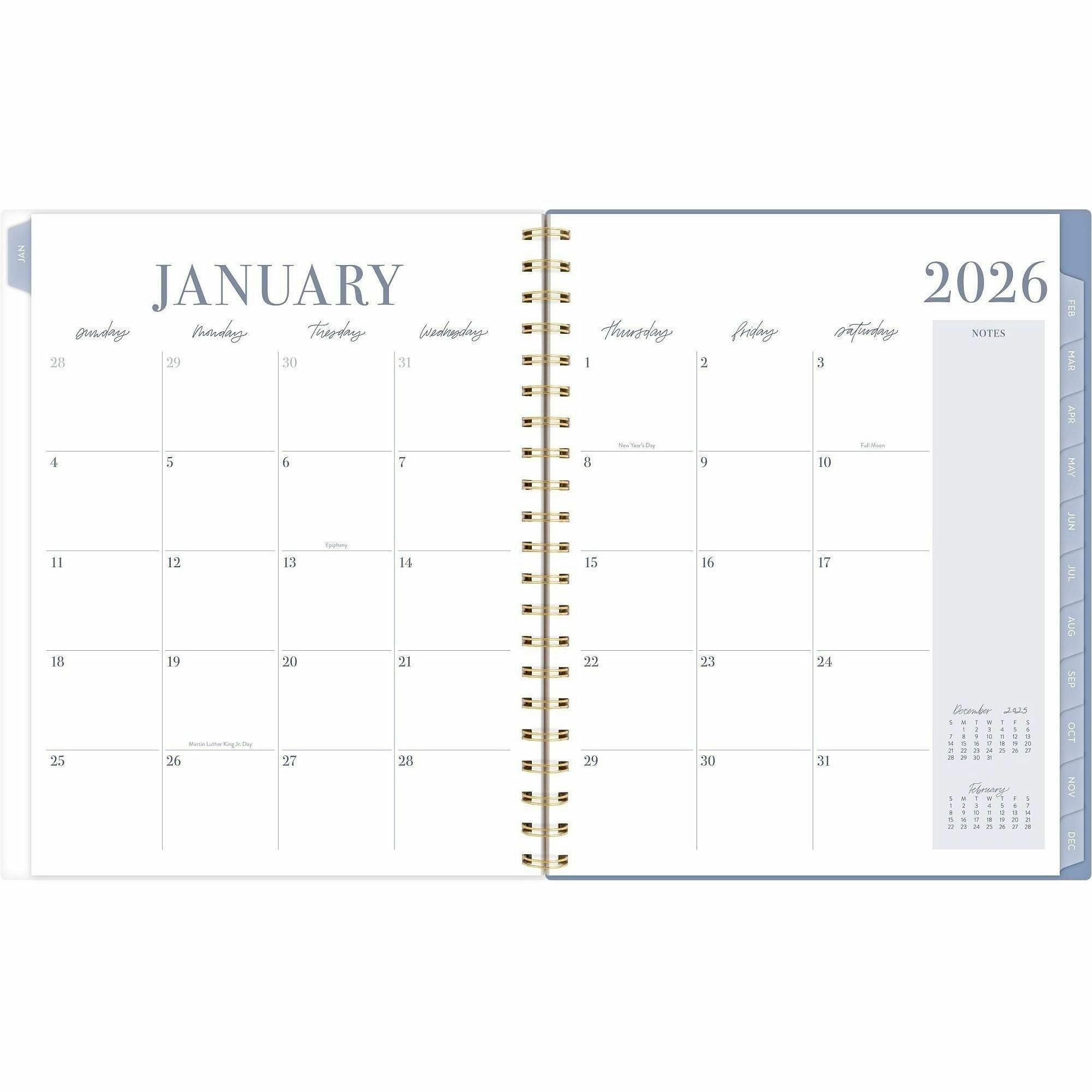 - Helpful monthly spreads with unruled daily blocks, a notes section, past and future reference calendars and a tab for easy navigation