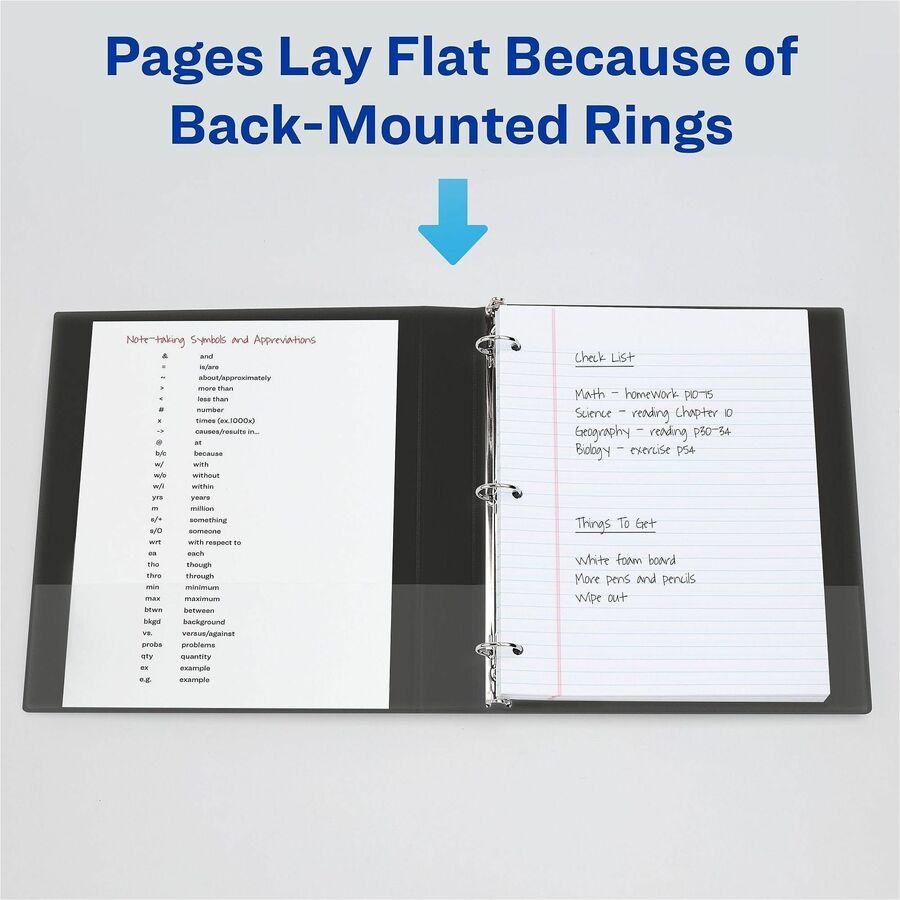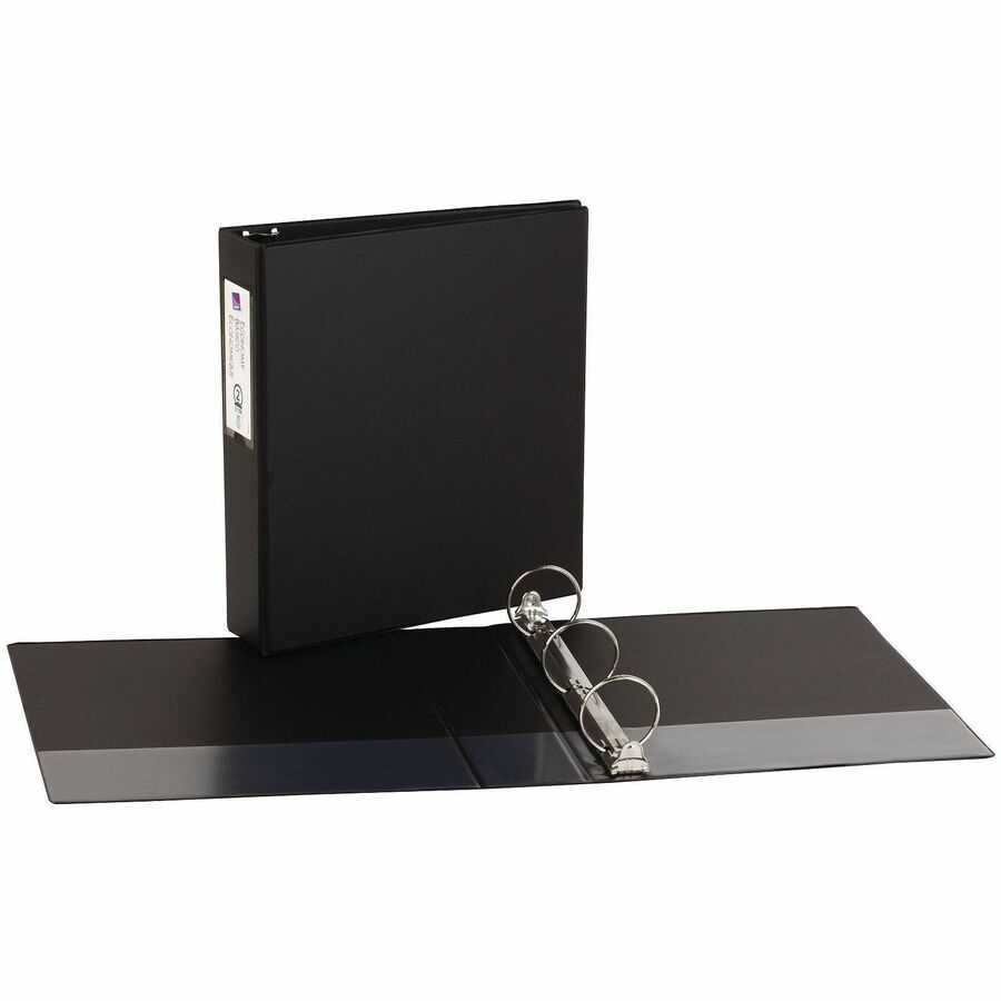 | Product Description | For convenient organization of your documents, it doesn't get much simpler than this handy Economy Binder with a label holder. Metal round rings mounted on the spine hold your letter-size papers securely in place to let you flip through notes, reports and more without getting your pages out of order. Binder is ideal for your class notes, employee handbooks and other important papers. 2" ring capacity holds approximately 375 sheets. Slip loose pages into the two interior pockets for easy access later. Each pocket holds up to 20 sheets. The black matte cover and spine combine with a black matte interior to reduce glare. Binder also features concealed rivets, vinyl construction and a sturdy chipboard core. |