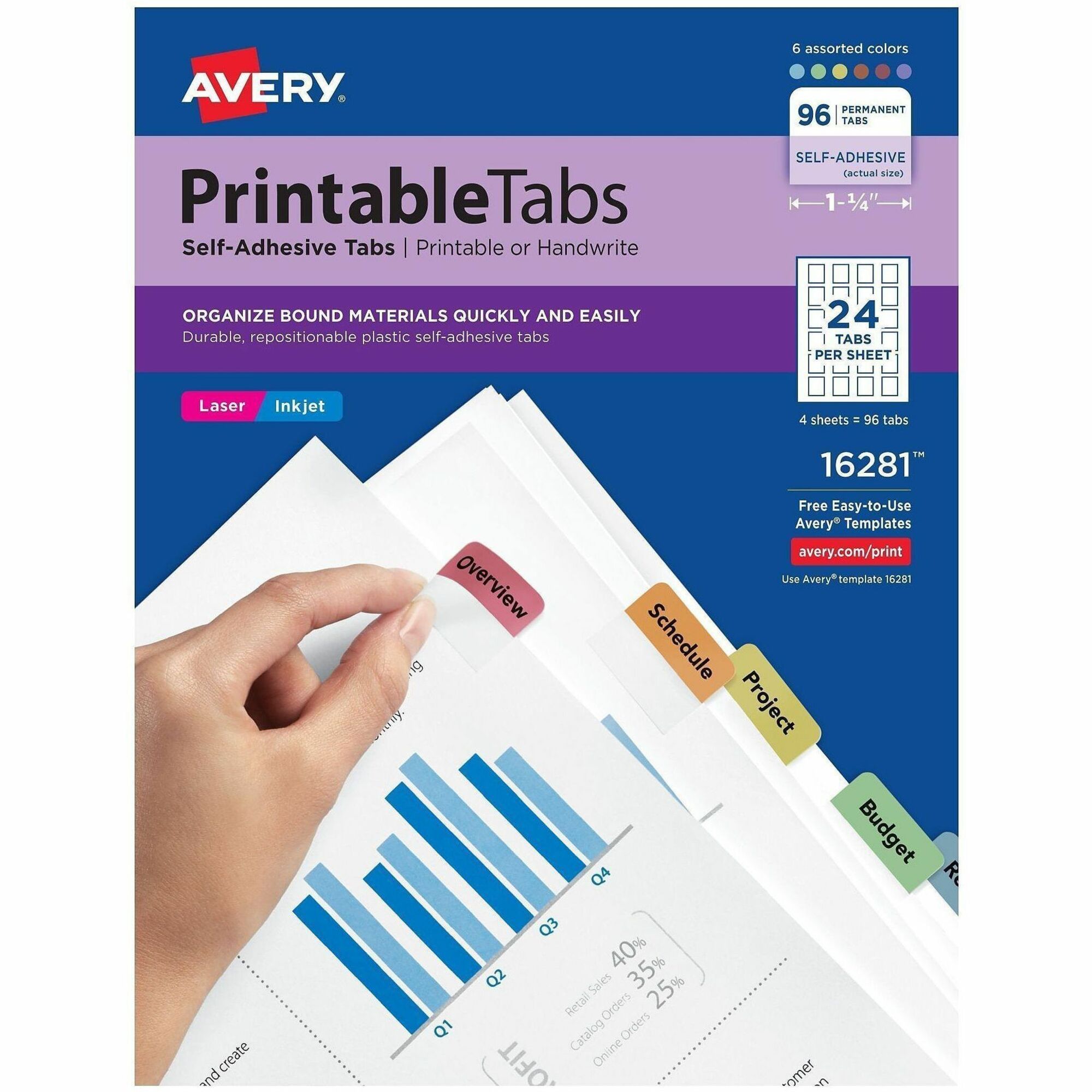 | Product Description | Print text directly on durable plastic tabs using your PC and inkjet or laser printer, or write directly on tabs. Attach tabs to edge of any size page to organize and index bound reports, presentations, reference manuals and catalogs. Special adhesive allows tabs to be repositioned when applied but become permanent over time for added security. Each pack includes four sheets of tabs. Avery offers many easy-to-use templates for Microsoft Word and other popular software programs. |