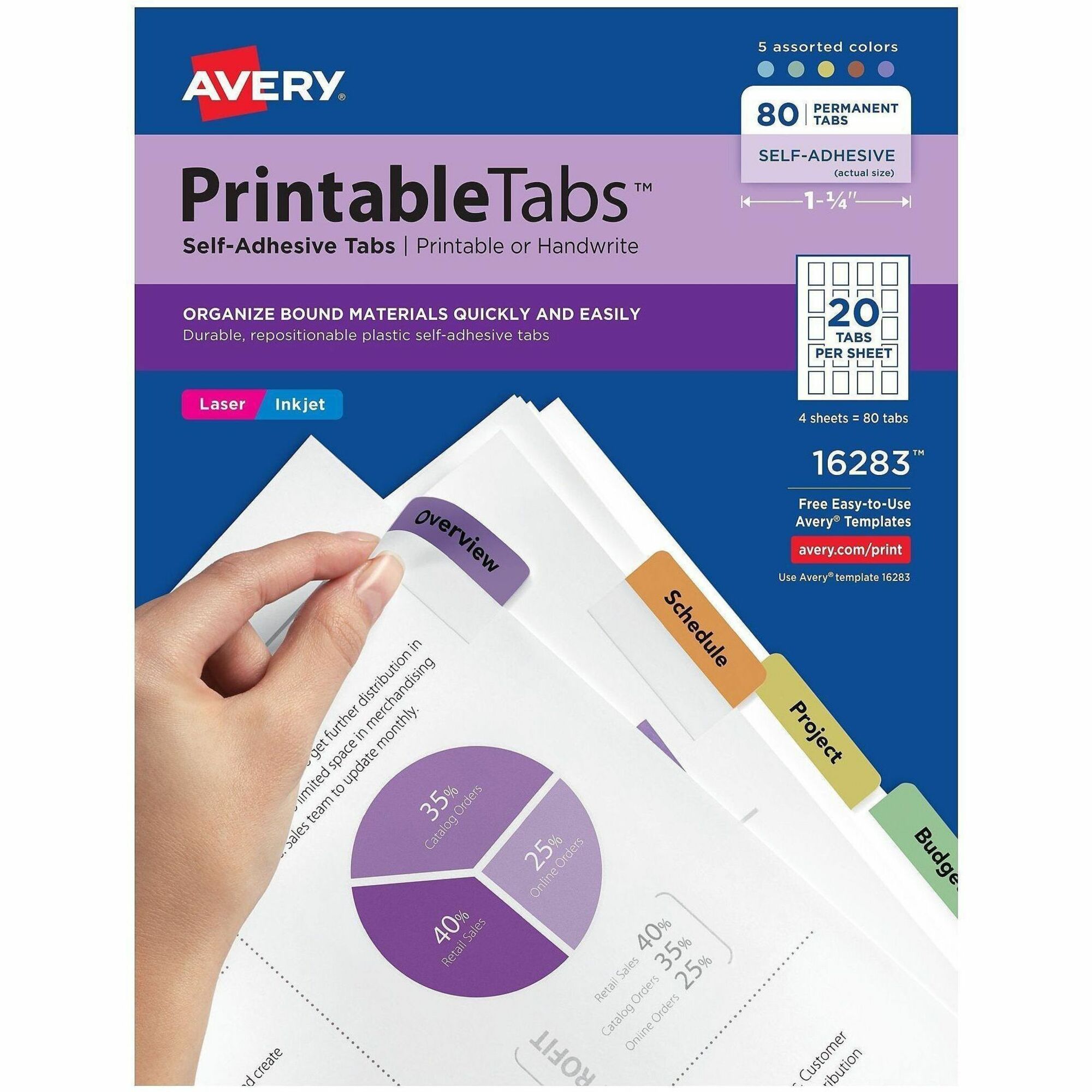 | Product Description | Print text directly on durable plastic tabs using your PC and inkjet or laser printer, or write directly on tabs. Attach tabs to edge of any size page to organize and index bound reports, presentations, reference manuals and catalogs. Special adhesive allows tabs to be repositioned when applied but become permanent over time for added security. Each pack includes four sheets of tabs. Avery offers many easy-to-use templates for Microsoft Word and other popular software programs. |