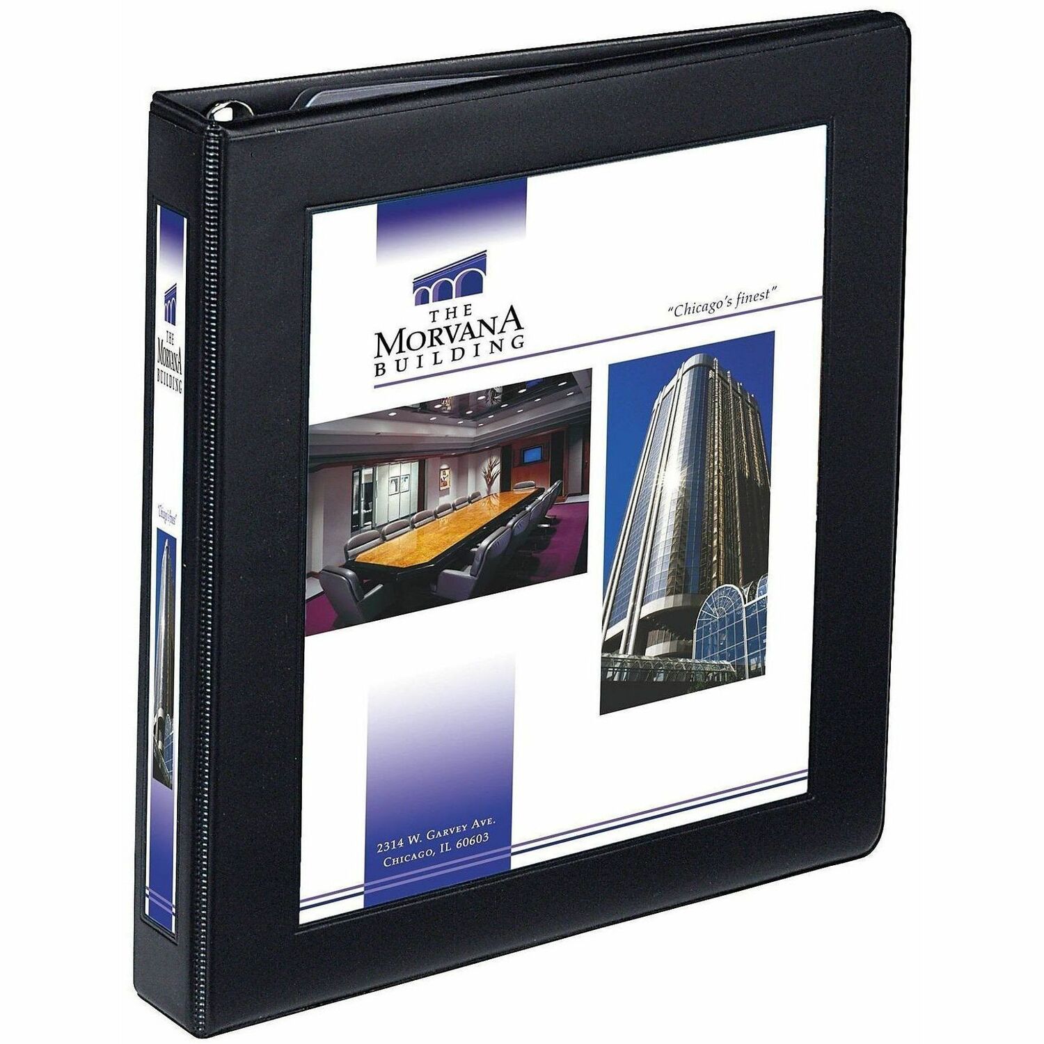 | Product Description | Binder perfectly frames and centers your title page for a professional look. Special mounting base keeps title page in place. Easily insert title page and spine ID with convenient mounting sheets. Overlay material on front and spine is crystal-clear. One-Touch EZD Locking Rings open with ease and keep pages secure. EZD rings also have a higher page capacity compared to same-size round rings. Gap-Free ring feature prevents gapping and misalignment of rings. Pages lie flat with these back-mounted metal rings. 1" ring capacity accommodates approximately 275 sheets. Binder also features two clear interior pockets, a sturdy chipboard core, and exposed rivets on back. Each pocket holds up to 20 sheets. Wider front and back binder panels fully cover standard dividers and sheet protectors so you can keep your paperwork and tabs protected. Binder is made with heavy-duty vinyl. |