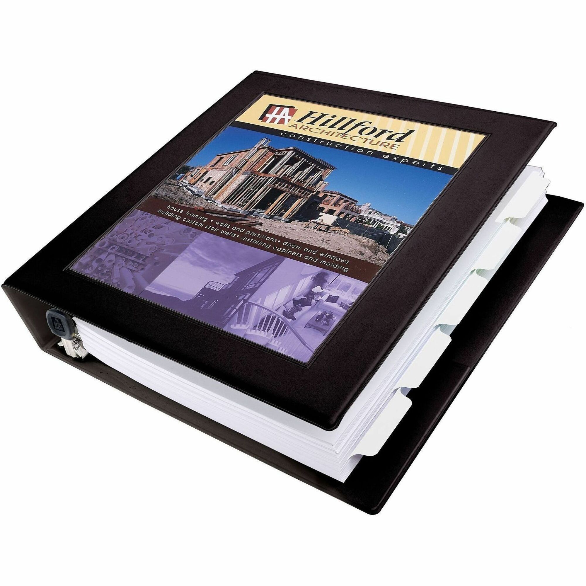 | Product Description | Binder perfectly frames and centers your title page for a professional look. Special mounting base keeps title page in place. Easily insert title page and spine ID with convenient mounting sheets. Overlay material on front and spine is crystal-clear. One-Touch EZD Locking Rings open with ease and keep pages secure. EZD rings also have a higher page capacity compared to same-size round rings. Gap-Free ring feature prevents gapping and misalignment of rings. Pages lie flat with these back-mounted metal rings. 1-1/2" ring capacity accommodates approximately 400 sheets. Binder also features two clear interior pockets, a sturdy chipboard core, and exposed rivets on back. Each pocket holds up to 20 sheets. Wider front and back binder panels fully cover standard dividers and sheet protectors so you can keep your paperwork and tabs protected. Binder is made with heavy-duty vinyl. |