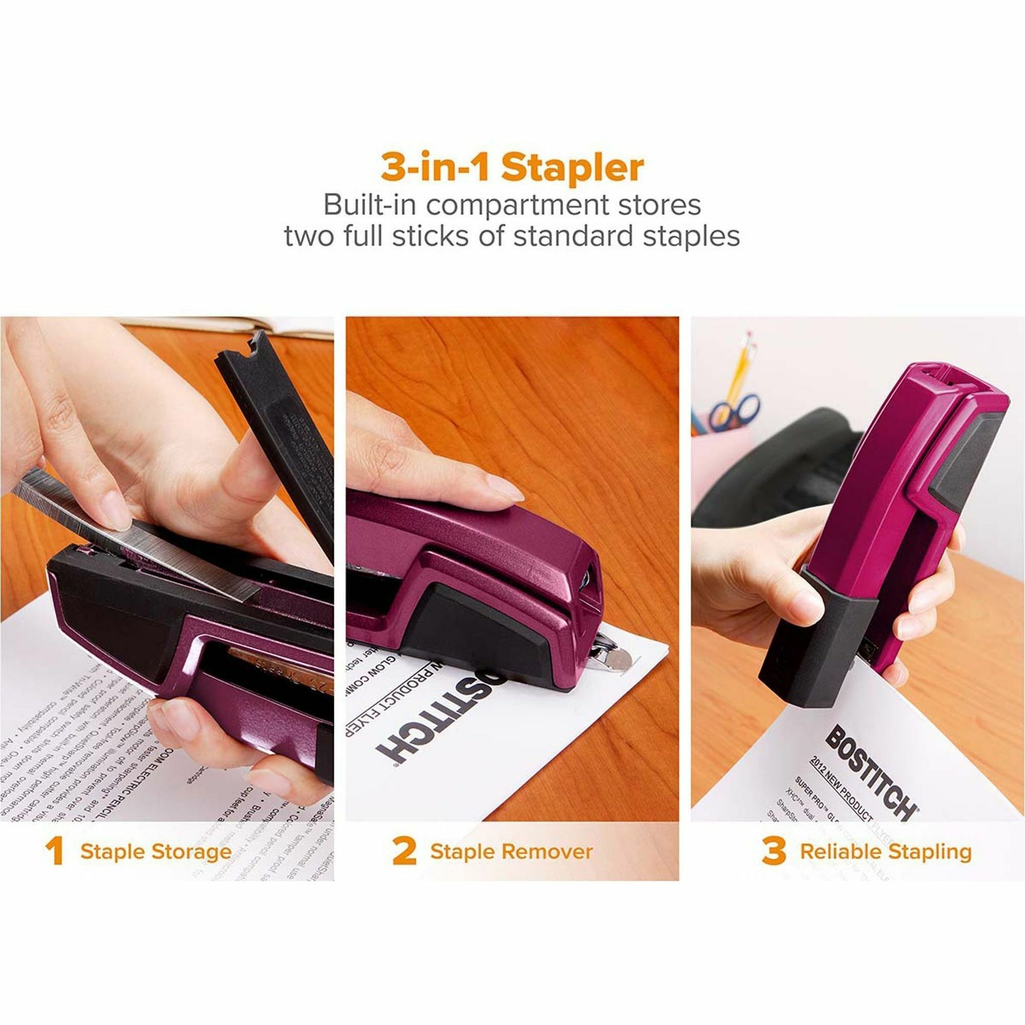 | Product Description | Epic Stapler offers ultimate durability and efficiency in a premium, classic design. Die-cast metal construction ensures long-lasting performance while soft rubber grip and base provide comfort during use. Antimicrobial protected, full-strip stapler delivers efficiency with a swing-out staple EZ Remover and a hidden StapleStore compartment on the bottom of the unit to keep two staple strips on hand. Accenting any desk, it stands vertically or horizontally for easy access and storage. This stapler opens 180 degrees for bulletin board tacking or crafting. It staples up to 25 sheets at a time. Full-strip staple capacity holds one strip of 210 standard staples. |