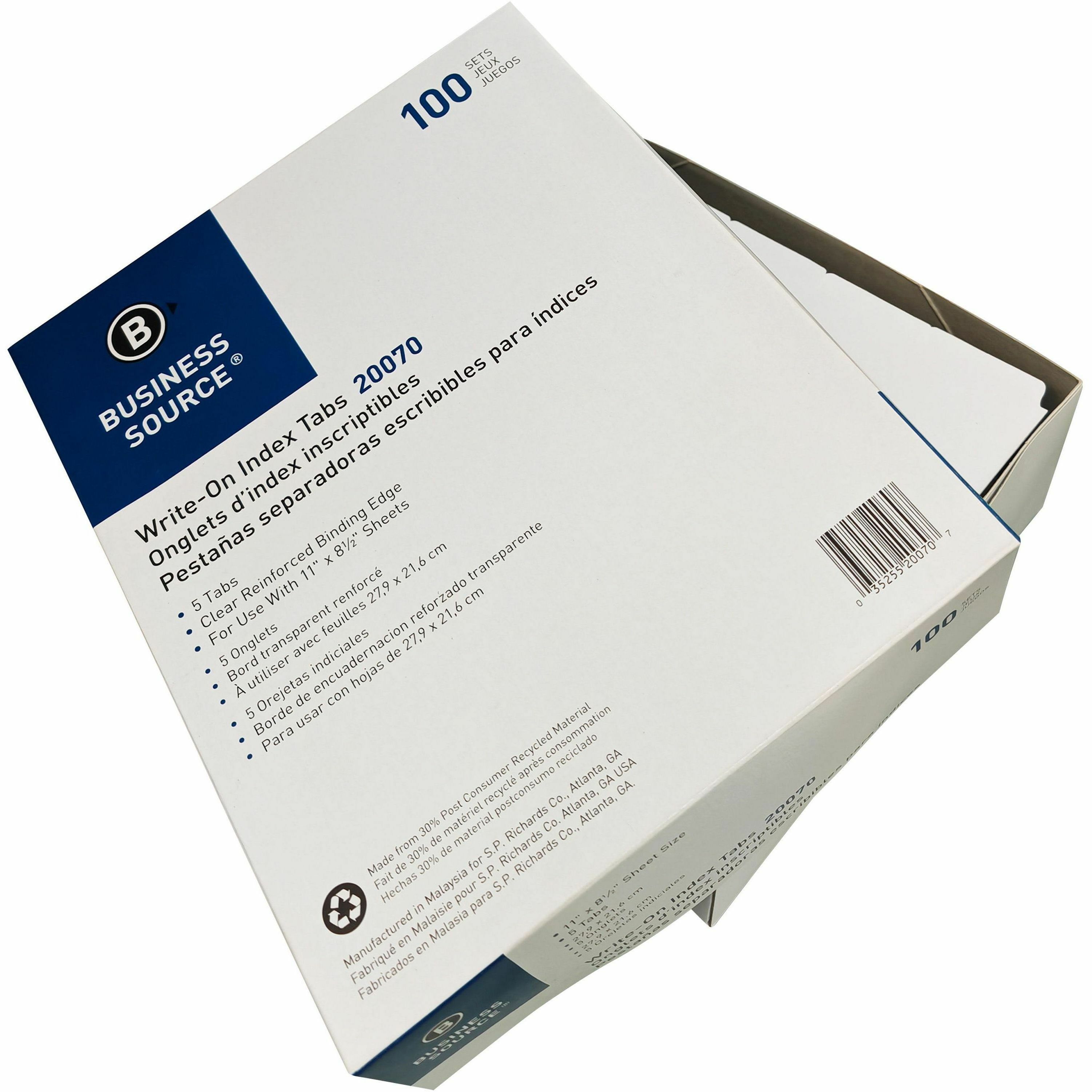 5 Write-on Tab(s) - 5 Tab(s)/Set - 2" Tab Width - 8.5" Divider Width x 11" Divider Length - Letter - 3 Hole Punched - White Divider - 100% Recycled - Mylar Reinforced Edge, Punched - 100 / Box