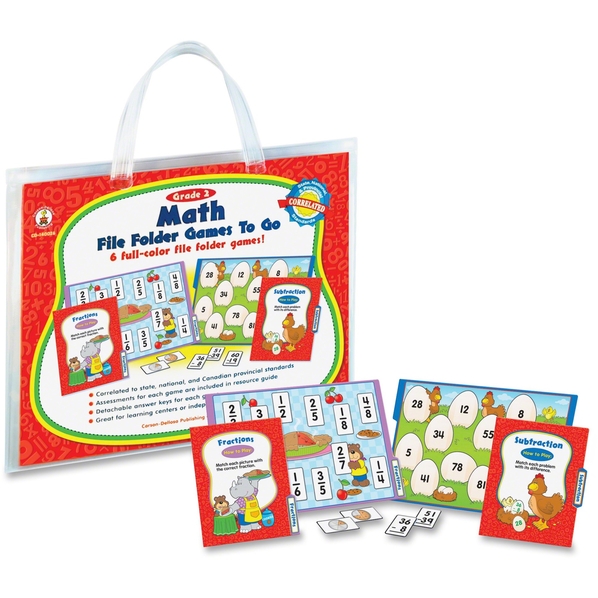 | Product Description | Full-color math games come in a convenient file folder. With preprinted game boards, you'll only need to cut and laminate the game pieces. Each set includes six games, a resealable storage tote and answer keys. Skills covered include addition, subtraction, fractions, time, money, addition with regrouping, and regrouping. Game pieces are color-coded to match game folders for easy organization. Math File Folder Games to Go File Folder is designed for students in second-grade (ages 7 to 8). |