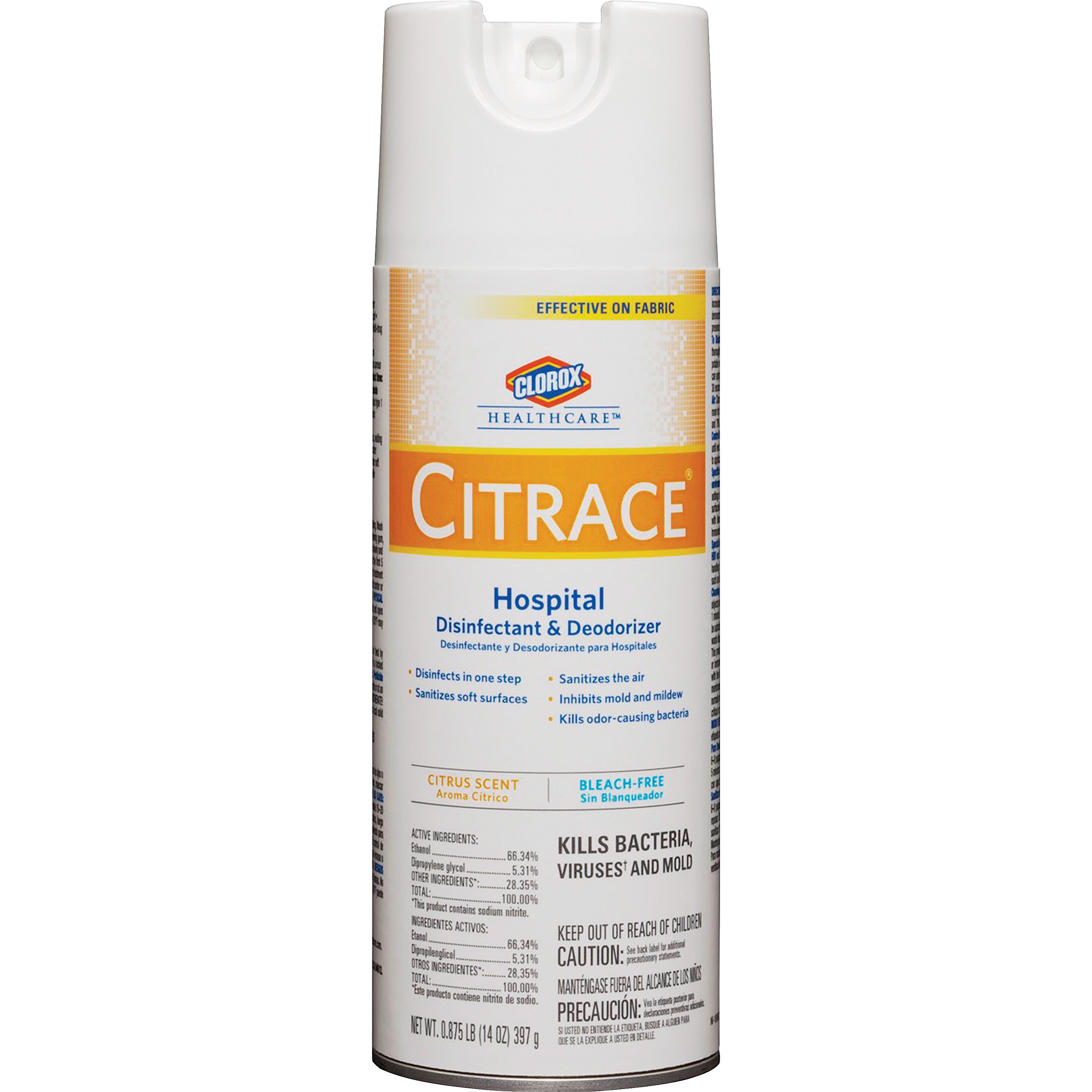 | Product Description | Healthcare Citrace Hospital Disinfectant and Deodorizer kills microorganisms on soft surfaces, hard surfaces and more. It kills 99.9 percent of bacteria on soft surfaces in just 30 seconds. To help prevent the spread of pathogens that can contribute to healthcare-associated infections, regularly spray this disinfectant on fabric or upholstered surfaces including privacy curtains, upholstered furniture, cushions, lab coats and linens. EPA-registered disinfectant kills 24 microorganisms on hard surfaces in 5 minutes. Simply spray and let air dry on equipment such as light switches, telephone receivers, remote controls, wheelchairs, empty wastebaskets, supply carts and bathroom basins. With a fresh citrus scent, Citrace eliminates odors from the air instantly by killing the bacteria that causes them. Its light citrus scent disappears rapidly to leave areas smelling fresh and clean It is intended for use in commercial settings. |