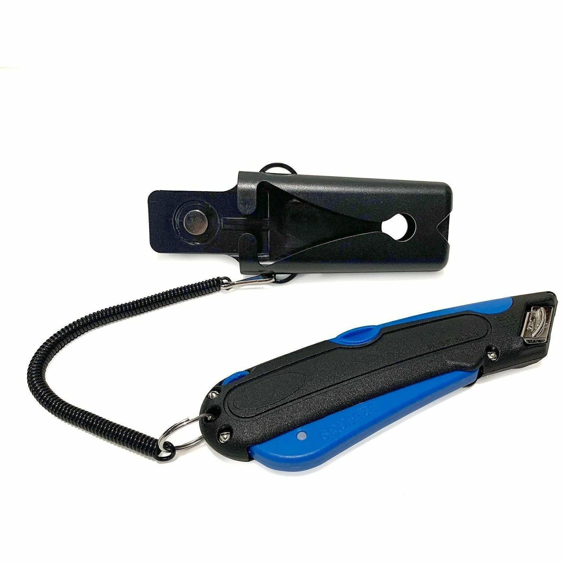 | Product Description | Utility knife features safety-tipped blades that retract automatically upon release of the handle. Handle is designed with a blade storage compartment that is pre-stocked with three replacement blades. Holster conveniently stores the utility knife when not in use. Lanyard clips to both the handle and holster to keep them together at all times. |