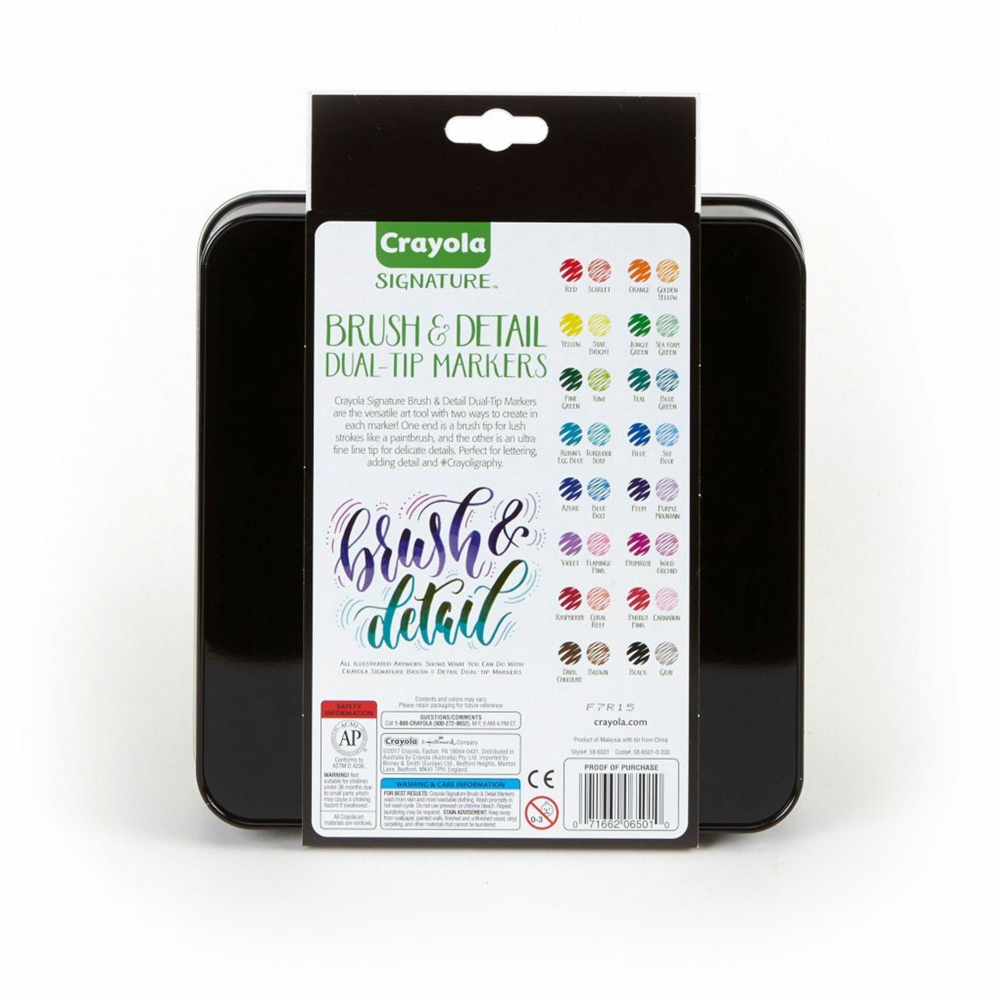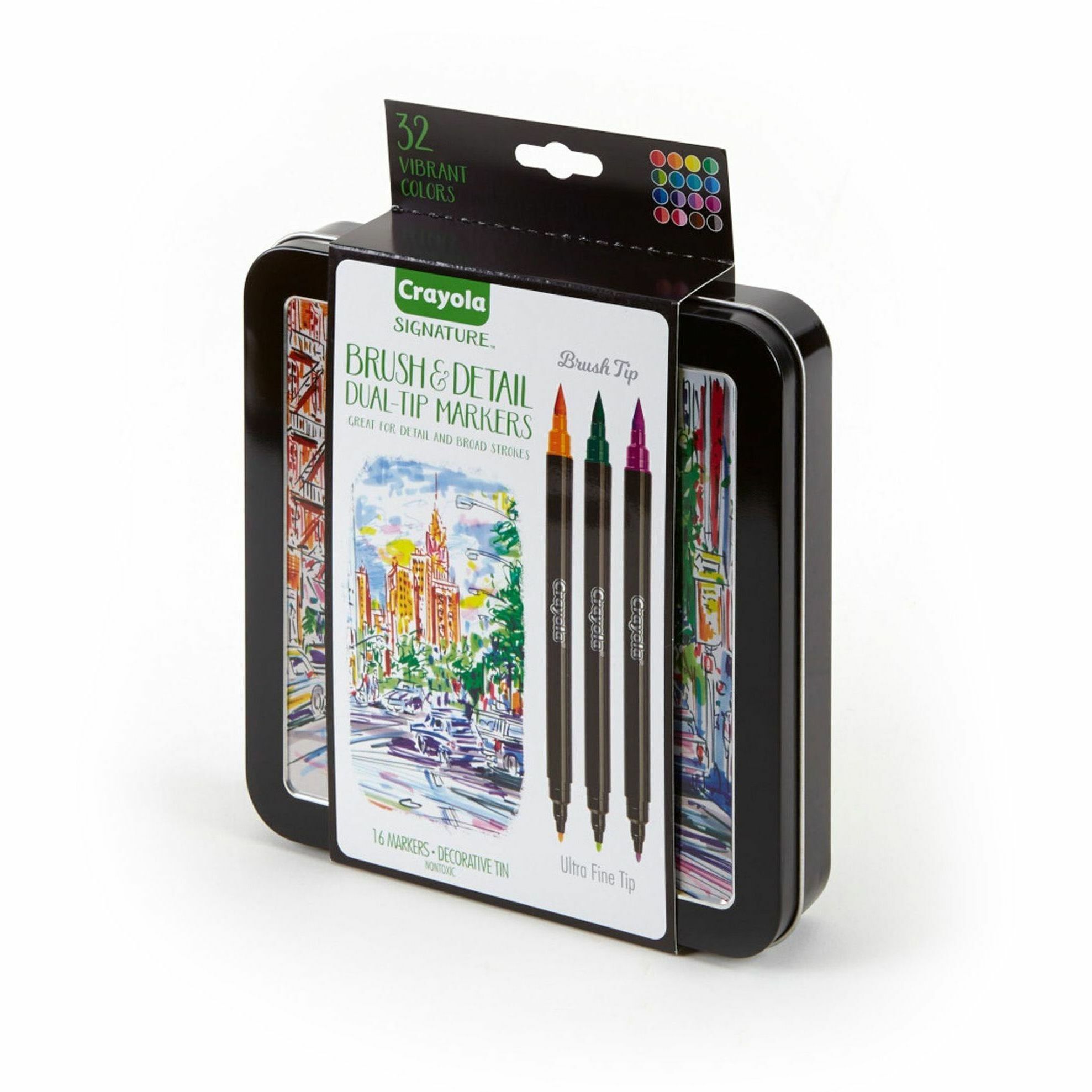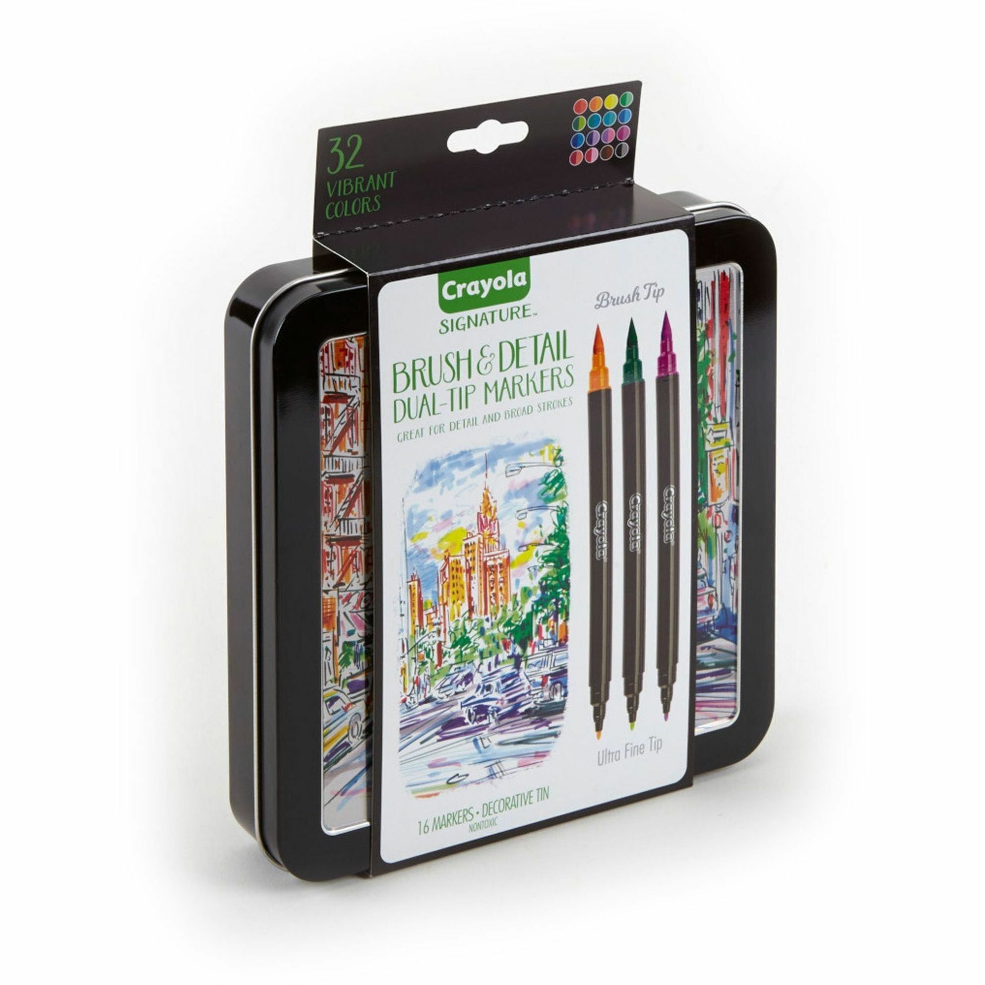 | Product Description | Signature Series markers are great for detail and broad strokes in 32 vibrant colors. They have a brush tip on one end and an ultra-fine tip on the other for creative versatility in coloring and art projects. Sketch, draw and blend colors for brilliant outcomes. Enjoy twice the colors to create double the coloring fun. Decorative tin protects and stores the nontoxic markers. |