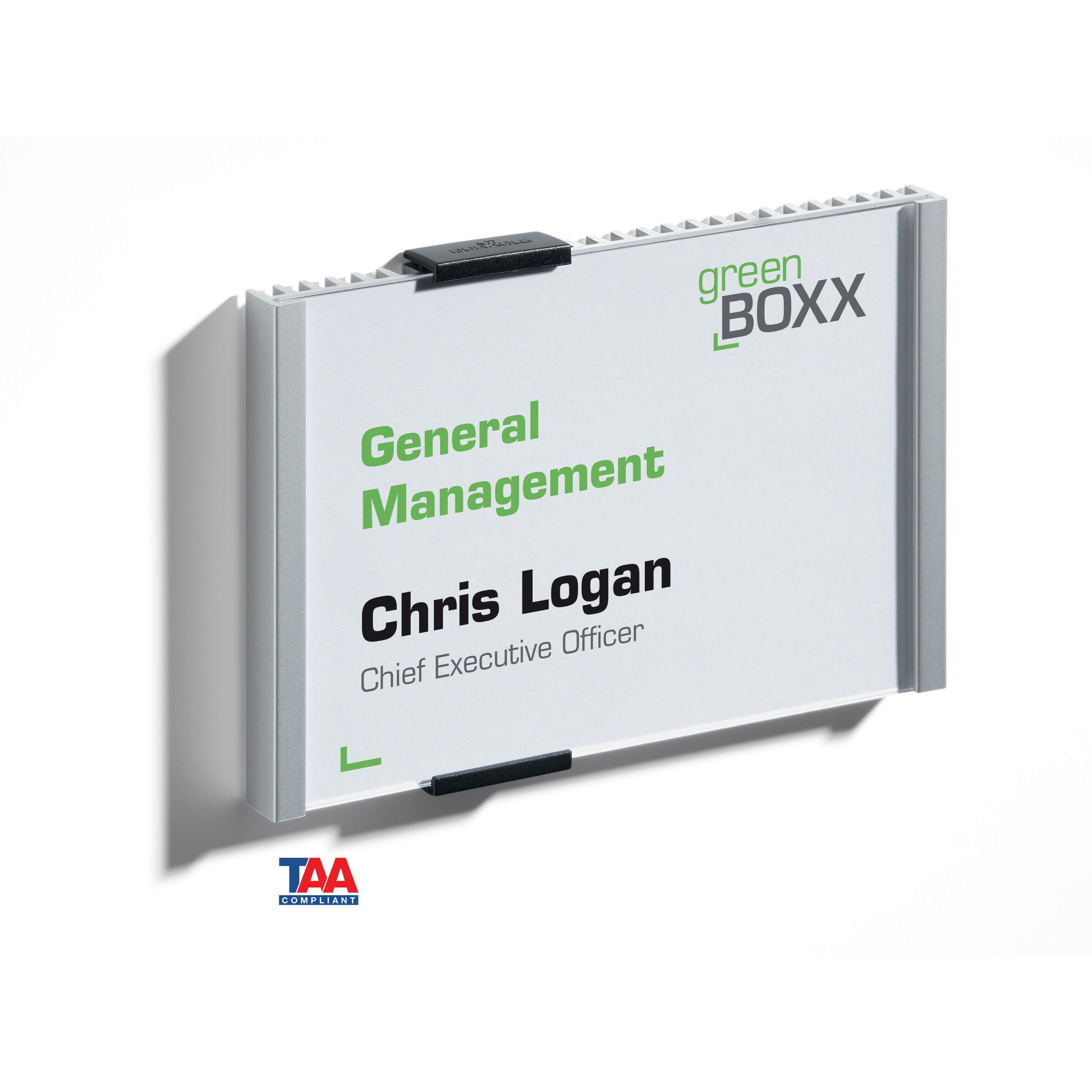 | Product Description | Information sign features a removable top clip for instant updates whenever changes occur. Clear acrylic panel completely showcases your insert for excellent visibility. Aluminum back plate is pre-drilled for easy wall mounting with the included screws and anchors. Plus, adhesive disks provide another way to mount the sign. The elegant back ribs form an attractive design that complements all decors. Use the free, online insert-formatting software to make professional style signs. Sign is compatible with Durable, printable replacement insert packs (sold separately). |