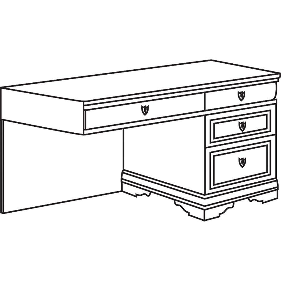 Office ensemble blends old world styling and modern functionality with clean flowing lines and bold classic arches. Offers generously shaped crown and base moldings, picture frame drawer and door fronts and rounded top edges. Drawers feature three-sided construction of 7/16" wood dovetailed to drawer front. Box drawers have 100 lb. rated slides. File drawers have 150 lb. rated slides. All file drawers are equipped to accommodate front-to-back letter-size or side-to-side legal-size hanging file folders. All drawers have metal, fully extending slides, built-in cable accessibility, adjustable levelers and task and canister lighting. Computer applicable furniture features cable grommets and other access openings for easy and neat computer cable management. |
