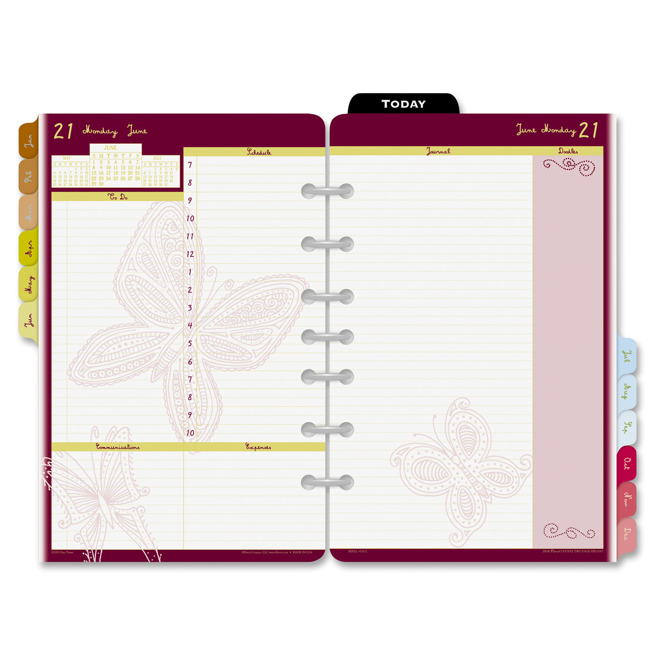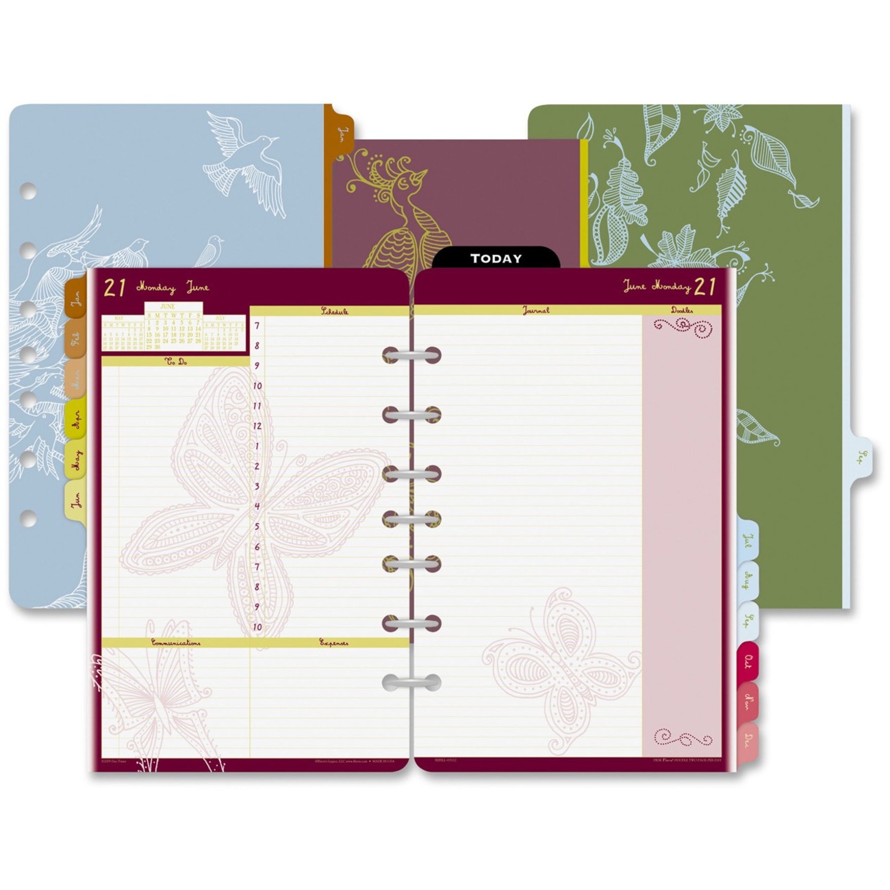 Doodle two-page-per-day refill offers room for doodling to help organize your thoughts, reduce workday stress and stretch your creative muscles. Doodling while listening can improve recall up to 29 percent, according to a recent study. The left-hand page includes hourly appointment times from 7 AM to 10 PM, three ruled sections for a to-do list, commitments, reminders, expenses, and notes, and one past, current and future months reference. Right-hand page includes a ruled journal area for note-taking and room to doodle in an unruled area. Subtle, ghosted background designs do not interfere with the planning space. Colors rotate by quarter. Dated planning pages range 12 months from January to December. Seven-hole punched Doodle refill also includes one-page monthly tabbed calendars, page locator and reference pages. |