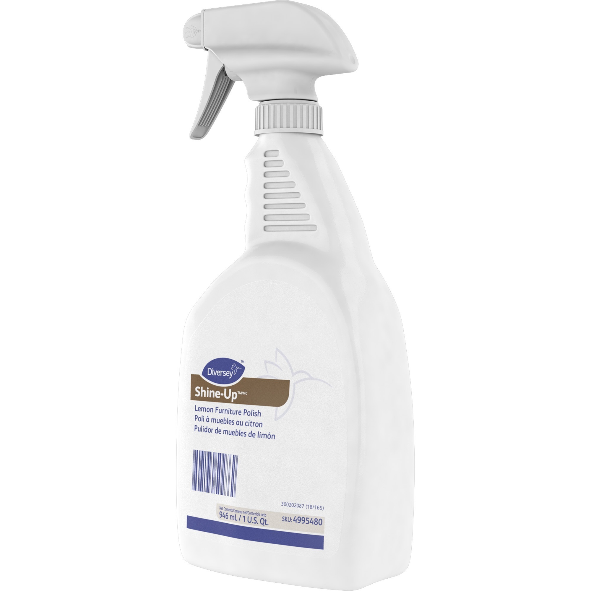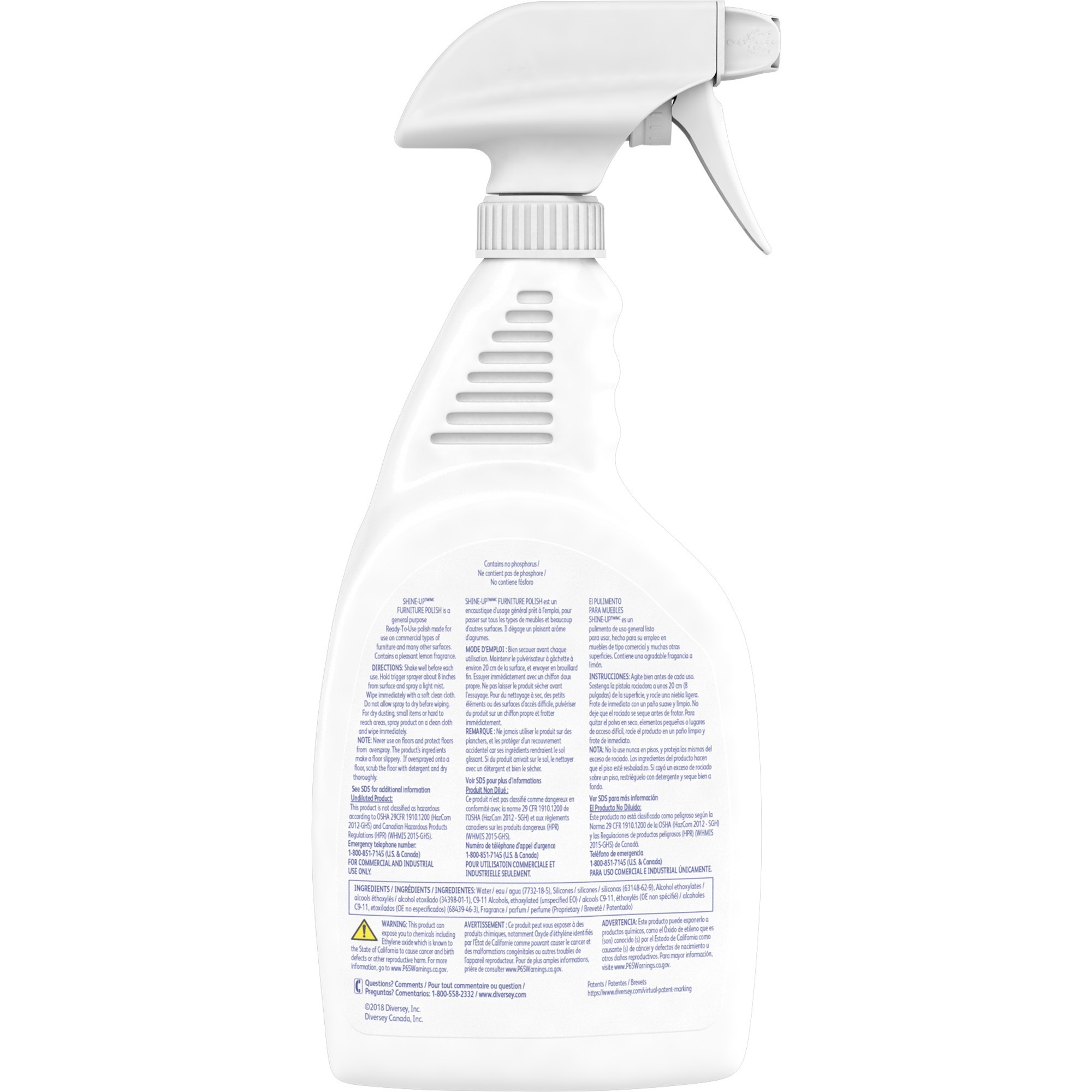| Product Description | Ready-to-use Shine-Up cleans and polishes furniture and hard wood to a beautiful shine. Furniture polish removes fingerprints, smudges and common oil-based marks. It resists smears and fingerprints. Rich blend of polishes provides a lustrous shine that helps protect against ordinary wear. White opaque, medium-viscosity liquid contains reduced VOC and offers a lemon scent. Also use this one-step furniture polish on other furniture surfaces such as ceramic and plastic tiles, chrome, stainless steel, porcelain, brass, vinyl, enamel, marble, stone, acrylics and fiberglass. |