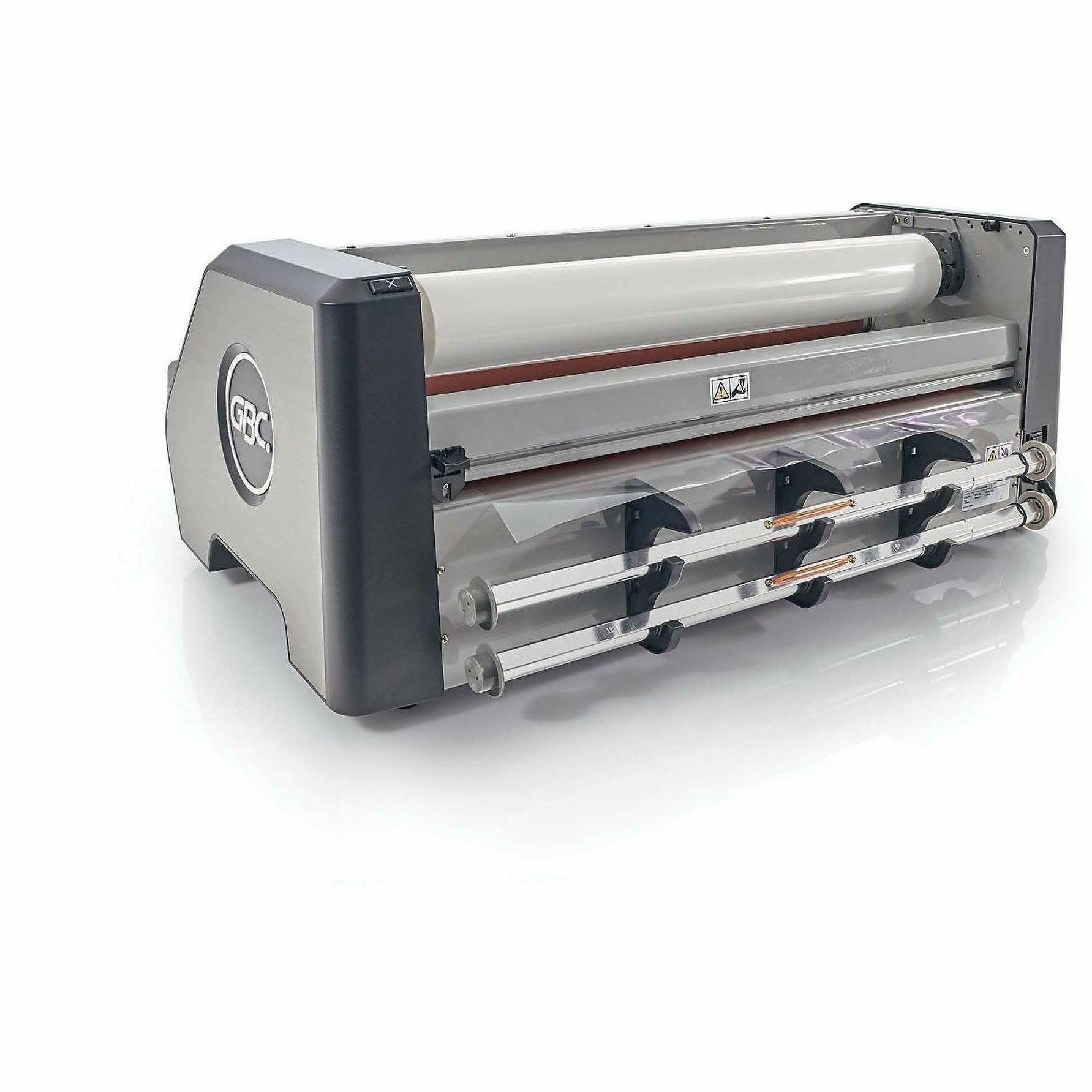 | Product Description | High-volume, extra-wide roll system provides high-quality results and laminates up to 27" wide at 10' per minute. Use with up to 3 mil roll film on a 1" core. Infrared heat rollers warm up in 10 minutes and eliminate cold spots for flawless lamination. One-touch keypad with preset temperature and speed controls makes it easy to use. Protective shield provides added safety. Auto standby after 1 hour and auto shutoff after 2 hours of nonuse conserve energy. LED light and audible alert signal 10-minute warm-up is complete. Laminator offers a built-in horizontal trimmer and motorized reverse function. |