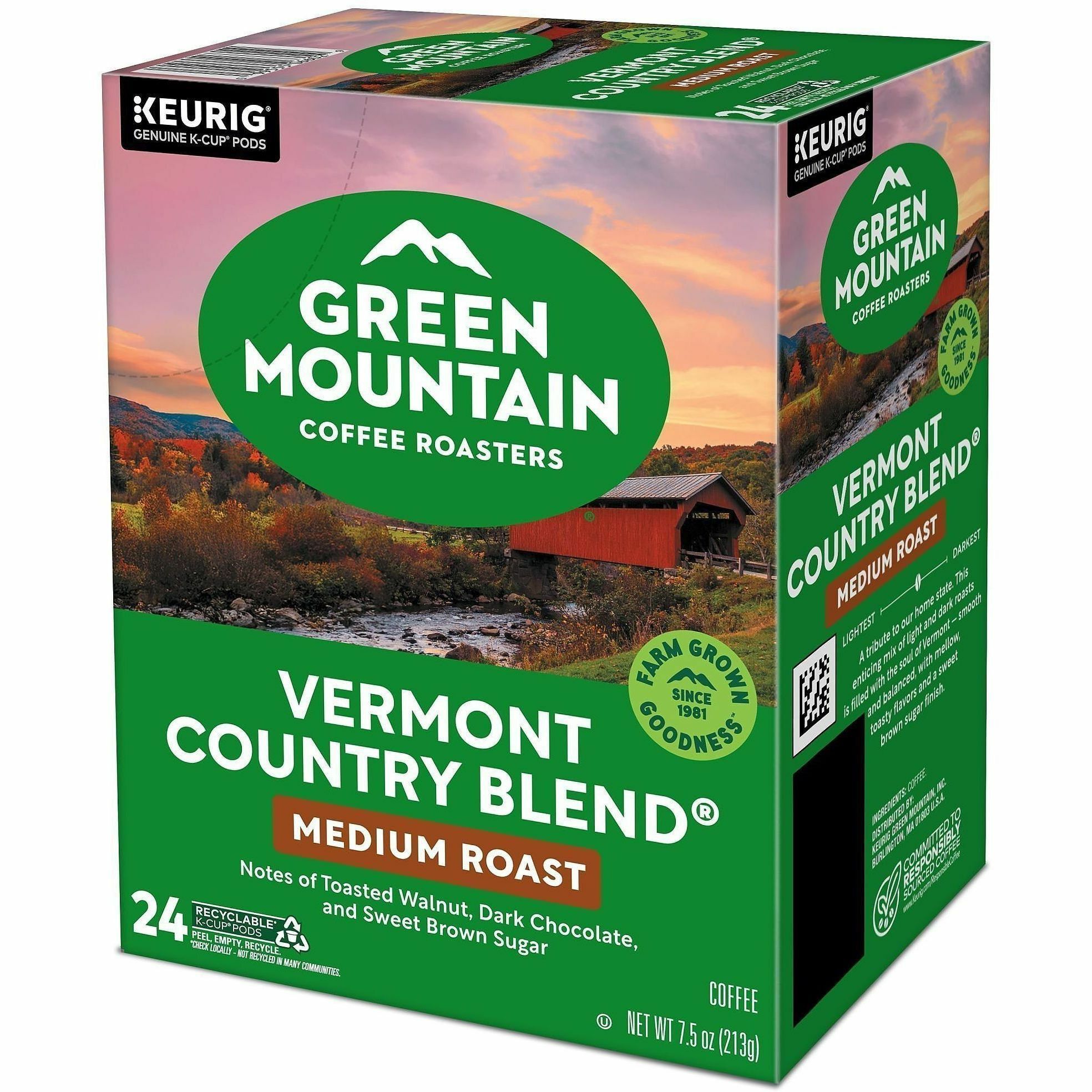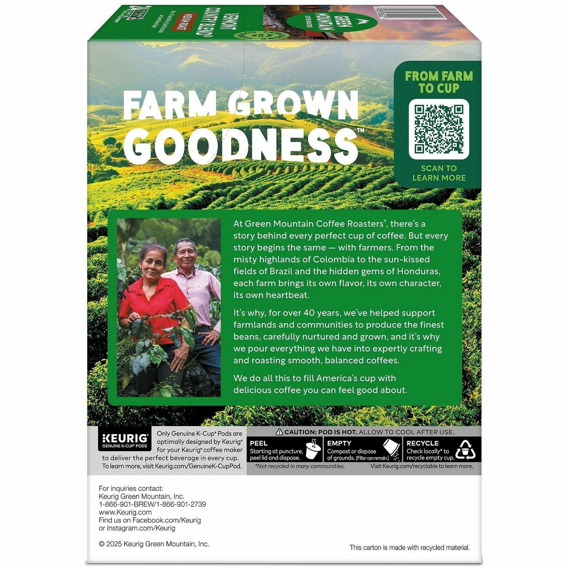 The mountains are a special place. It's where Green Mountain Coffee Roasters® was born. It's where we developed our adventurous spirit and commitment to improving the lands through sustainably sourced coffee. We're driven to bring the world a richer, better cup of coffee. Be bold. Be alive. Grab a cup and get out there.™ Green Mountain Coffee Roasters® Vermont Country Blend® is a tribute to our home state, it's a favorite among our blends. This enticing mix of light and dark roasts is filled with the soul of Vermont; smooth and balanced, with mellow, toasty flavors and a sweet brown sugar finish. Made with 100% Arabica coffee. These single-serve K-Cup® pods are compatible with all Keurig K-Cup® Pod Single-Serve Coffee Makers. Each K-Cup® pod is filled with the freshest ground coffee and brews a perfect, great tasting cup of coffee, every time. Certified Orthodox Union Kosher. What does being 100% responsibly sourced coffee mean? Responsibly Sourced means the coffee we purchase is grown and sold in adherence to a credible sourcing program that aligns with our company Responsible Sourcing Guidelines. Our coffee is 100% responsibly sourced. |