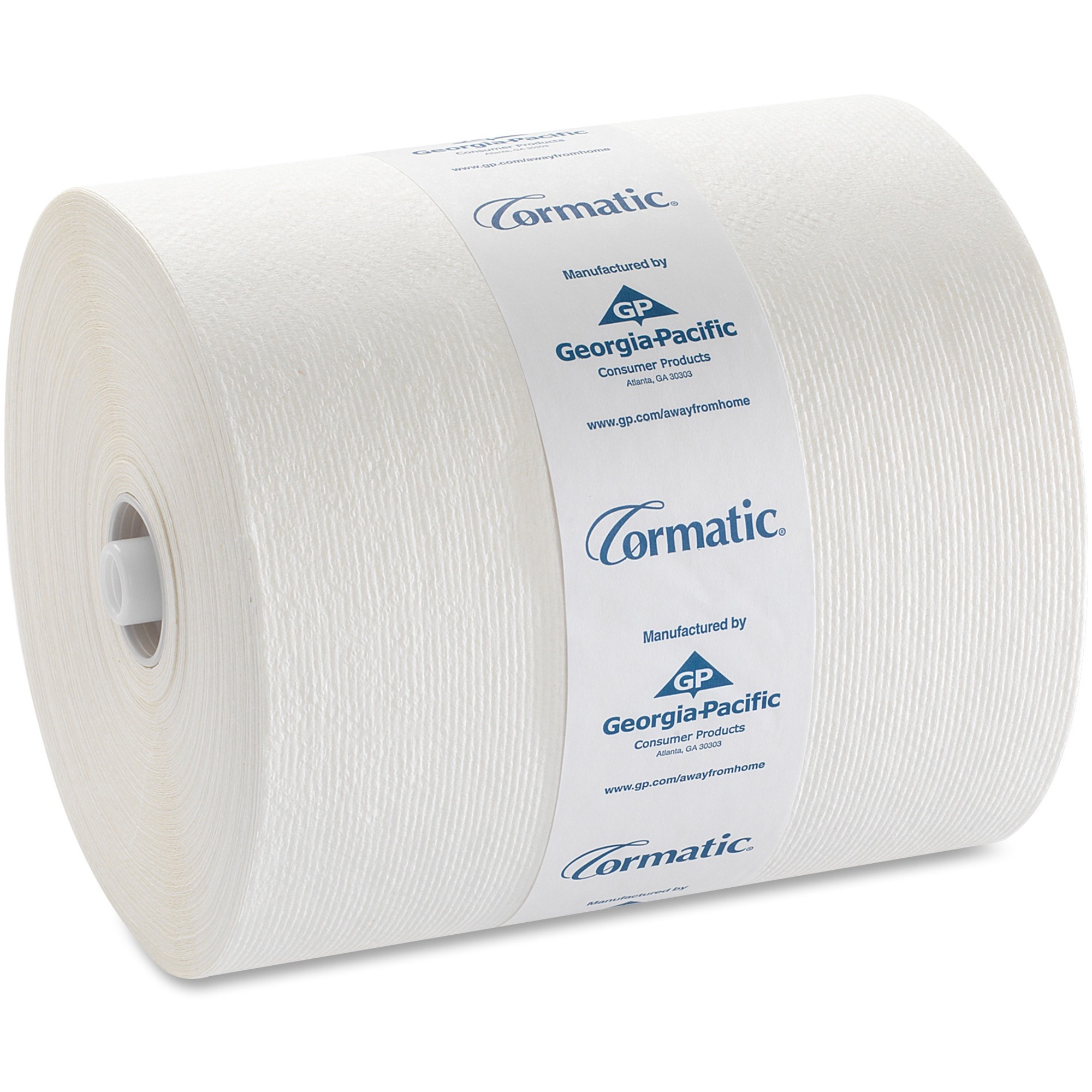 As part of the high-capacity, Cormatic roll-towel dispenser system solution, these white Thru-Embossed single-ply roll towels are designed to reduce maintenance time, minimize outages and reduce waste, making them ideal for high-traffic areas, office buildings, healthcare and foodservice facilities. Each nonslot roll contains more than 900 towels perfectly designed for complete customer satisfaction. Single-ply sheets deliver the softness, quick absorbency, durability and thickness patrons appreciate. |