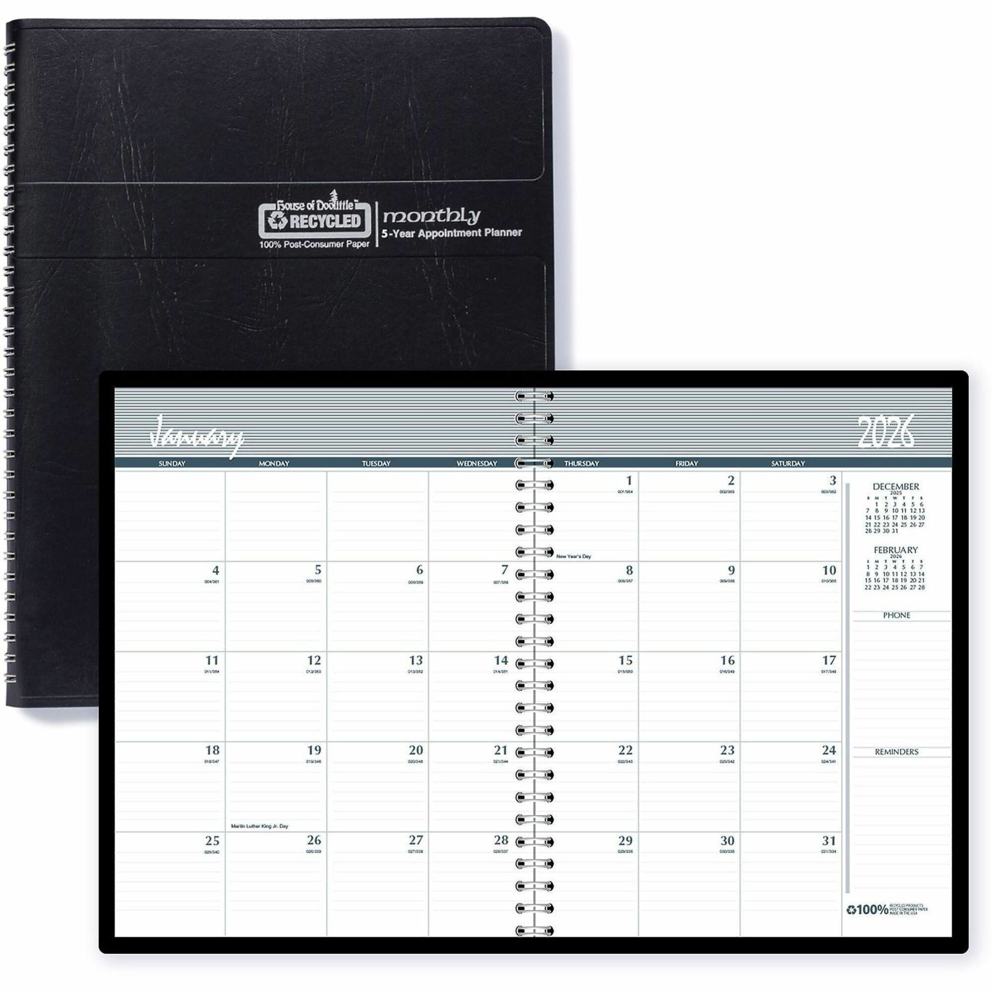 Julian Dates - Monthly - 62 Month - December 2024 to January - 1 Month Double Page Layout - Spiral Bound - Black - Black Cover - 11" Height x 8.5" Width - Dated Planning Page, Ruled Daily Block, Holiday Listing, Phone Log Page, Printed, Embossed, Double-sided Pocket, Expense Tracking - 1 Each