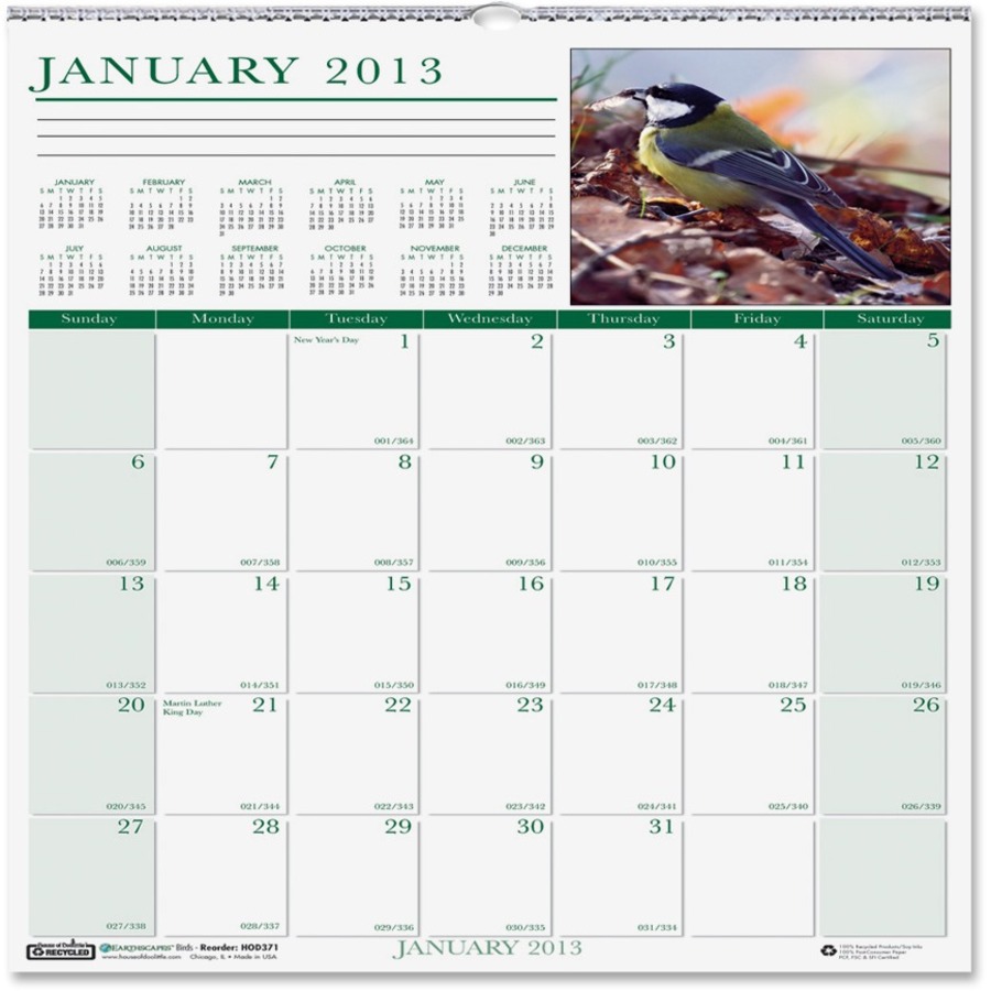 Wall calendar features a full-color bird photo on each month to enhance your planning. Dated planning pages range 12 months from January to December. One-page-per-month format includes unruled daily blocks (1-5/8" x 2"), numbered weeks, Sunday-through-Saturday scheduling, full-year calendar reference, and count of days/days remaining. Wall calendar is wirebound with a hanger and is printed with soy ink on paper made with a high percentage of recycled material. |
