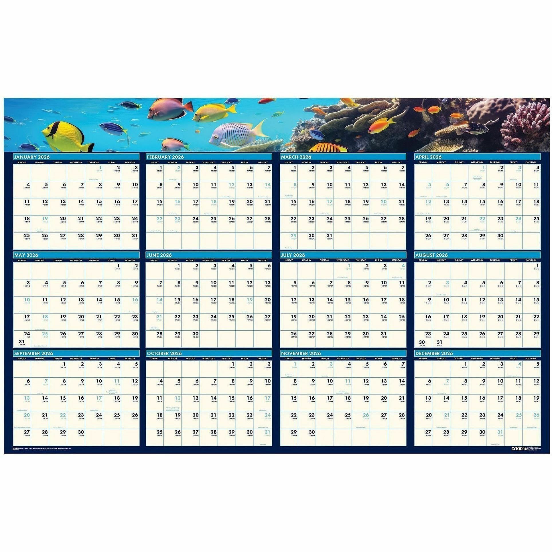 | Product Description | Two-sided, laminated wall calendar offers a full-color panoramic undersea photo along the top, write-on/wipe-off surface, numbered weeks and 12 months of dated planning on both sides. One side has a vertical format, and the other side has a horizontal format. Both sides have unruled daily blocks. Daily blocks on the vertical side measure 1-1/8" x 1-1/4" , and the horizontal side features 1-1/4" x 1-1/8" daily blocks. Dated planning ranges 12 months from January to December. Wall calendar also includes self-adhesive hangers and a water-soluble marker. Paper is made with a high percentage of post-consumer recycled fiber. |