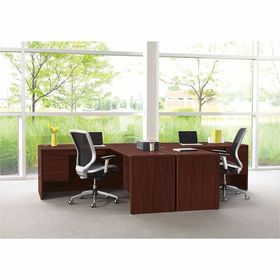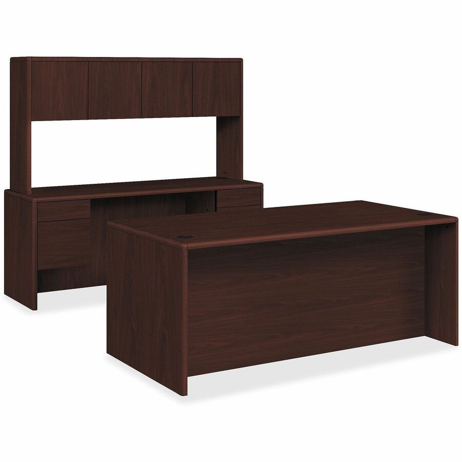 Right-pedestal desk is part of HON 10700 Series Laminate Wood Desks with worksurfaces and outer end panels clad in multilayer, high-pressure laminate that resists water, abrasions and most solvents. Rich Mahogany finish covers durable, 1-1/8" thick, solid-core, high-performance particleboard that resists warping. Elegant hardwood trim is stained to match the top-grade, stain-resistant laminate. User-friendly waterfall edges offer a gentle, curved profile. One full pedestal on the right maximizes versatile storage space with a box/box/file configuration. All drawers lock. Five-sided drawer construction allows easy drawer alignment. Hangrails in all file drawers offer side-to-side letter and legal filing and front-to-back letter filing. Double-pedestal desk also features double-radius edge detail; 10-1/2" recessed, woodgrain, breakfront modesty panel; and two worksurface grommets to route and hide cords. Adjustable hex leveling glides allow easy leveling without lifting. |