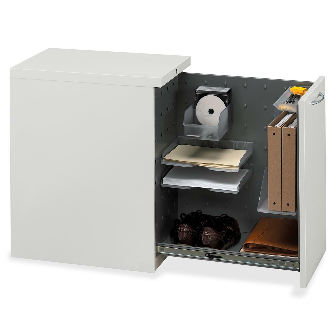 Flagship Side-Access Pedestal provides simple and personalized storage of DVDs/CDs, binders, files and project folders. Drawer opens for right side access to interior and uses ball-bearing suspension for easy opening and closing. Interior drawer includes an area designed for binder storage, a CD/DVD holder, pencil tray and two piling trays. Trays are adjustable in 3" increments throughout the case interior. Light gray pedestal is equipped with casters for easy movement and a HON "One Key" interchangeable, core-removable lock. Pedestal is certified by SCS to be in compliance with specific, indoor, air-quality emission requirements and meets or exceeds applicable ANSI/BIFMA standards. |