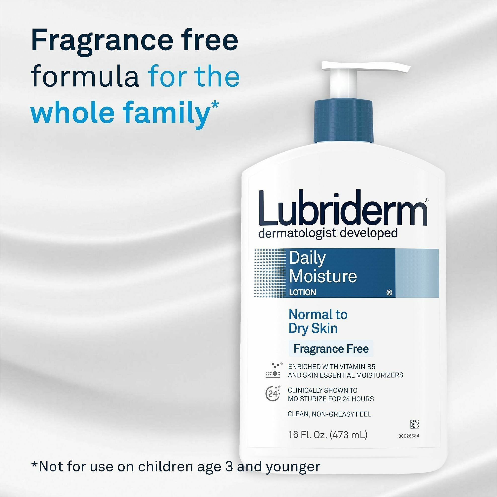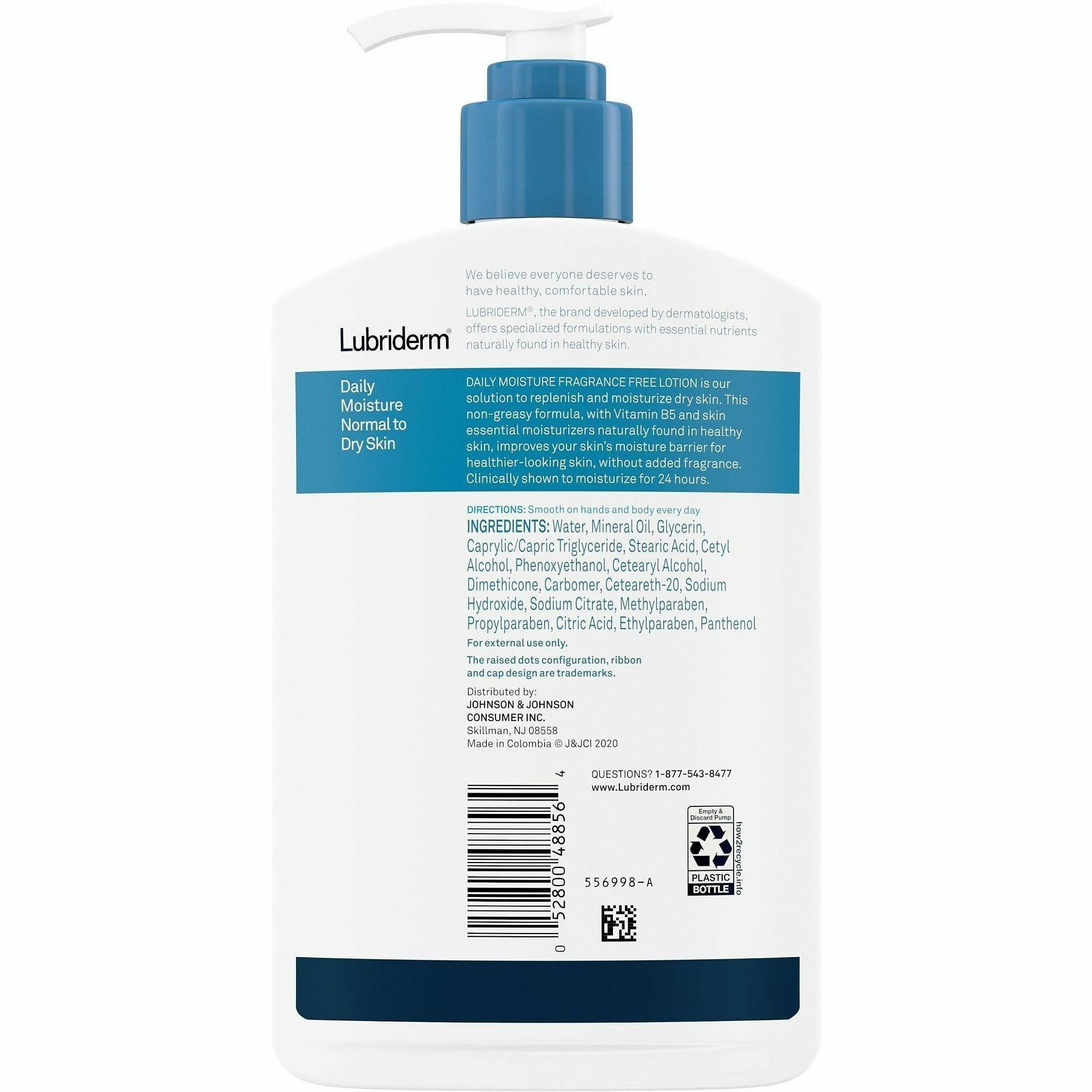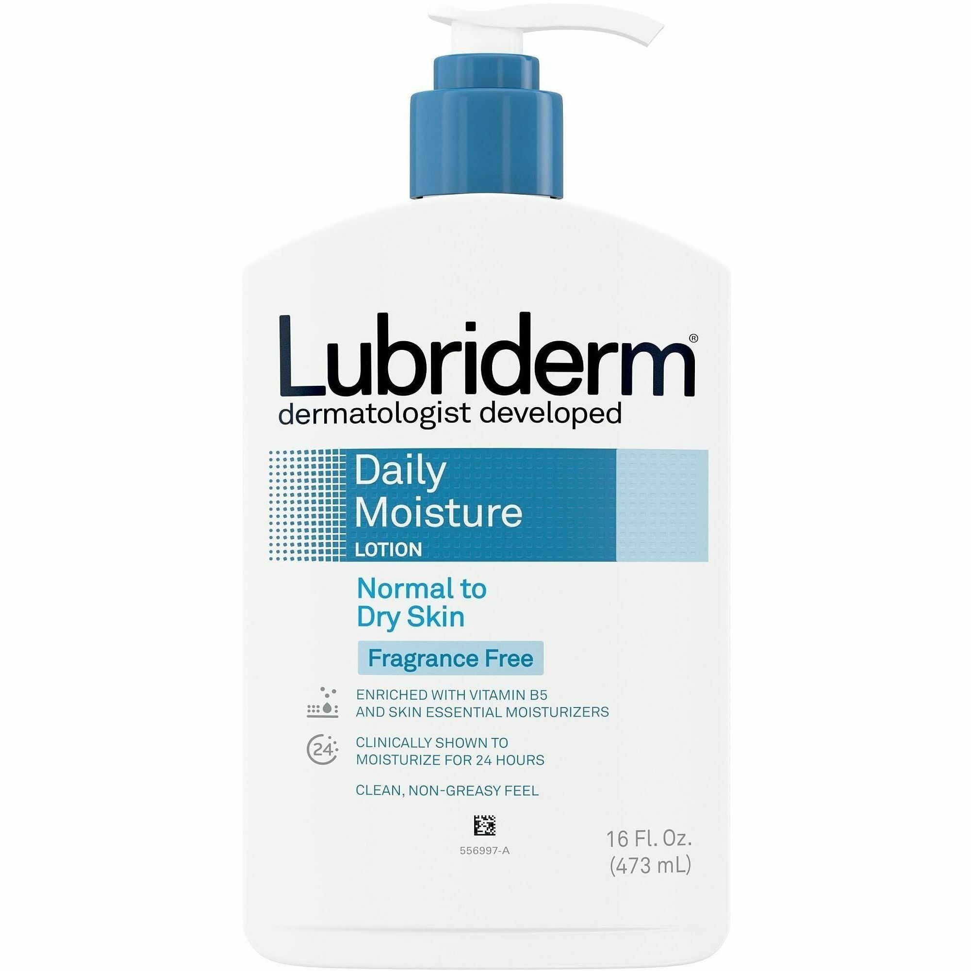 | Product Description | Ideal for normal-to-dry skin types, Lubriderm Daily Moisture Lotion replenishes and moisturizes dry skin. From a dermatologist-developed brand, this daily hydrating lotion is clinically shown to help moisturize dry skin for 24 hours, achieving healthy-looking skin. Lotion is enriched with Pro-Vitamin B5 and essential moisturizers naturally found in healthy skin to improve your skin's moisture barrier. Great for smoothing over hands and body every day, Lubriderm Daily Moisture Lotion is nongreasy for a clean, pleasant feel on the skin. |