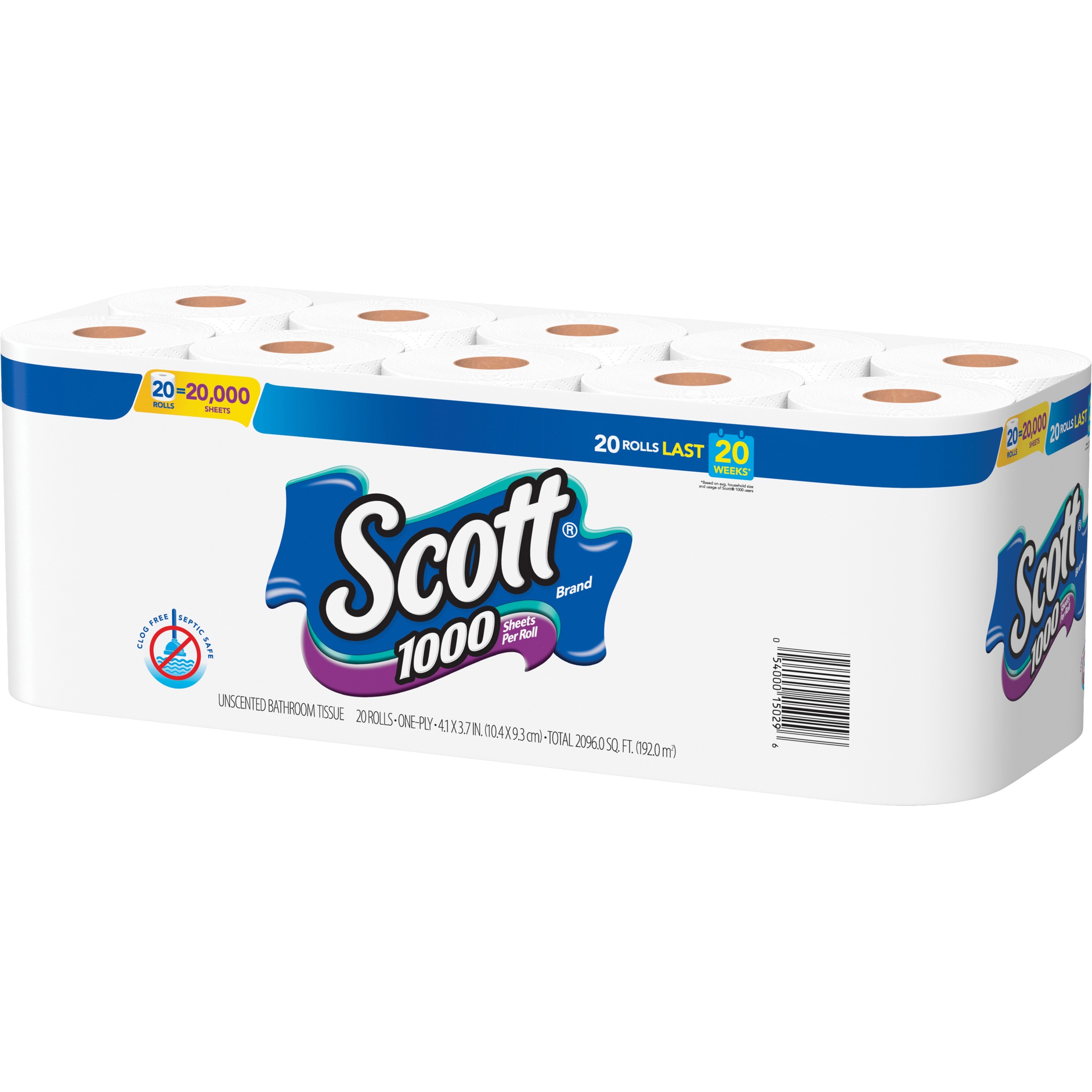 | Product Description | Take care of your office or family with Scott 1000 Bath Tissue and enjoy fewer roll changes and more value. Each toilet paper roll contains 1000 sheets. Plus, Scott 1000 one-ply bathroom tissue dissolves quickly so it's kinder to your plumbing and safe for sewer and septic systems. You can even use it in your RV or boat. |