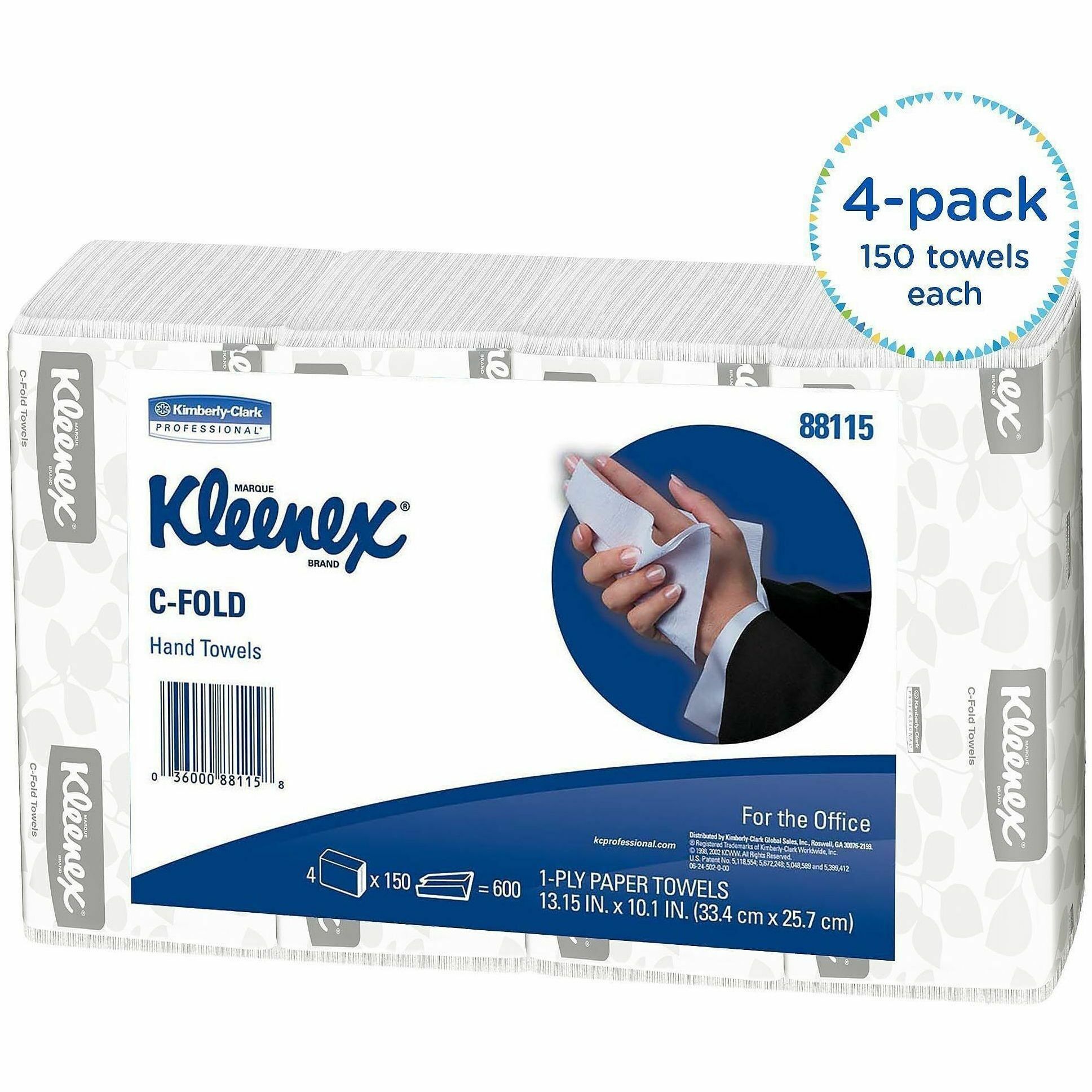 | Product Description | Kleenex C-Fold Hand Towels are designed for use with C-fold towel dispensers. Soft, absorbent, one-ply towels meet EPA standards with post-consumer recycled material. Each bundle has 150 towels. Folded size is 10-1/10" x 3-1/2". |