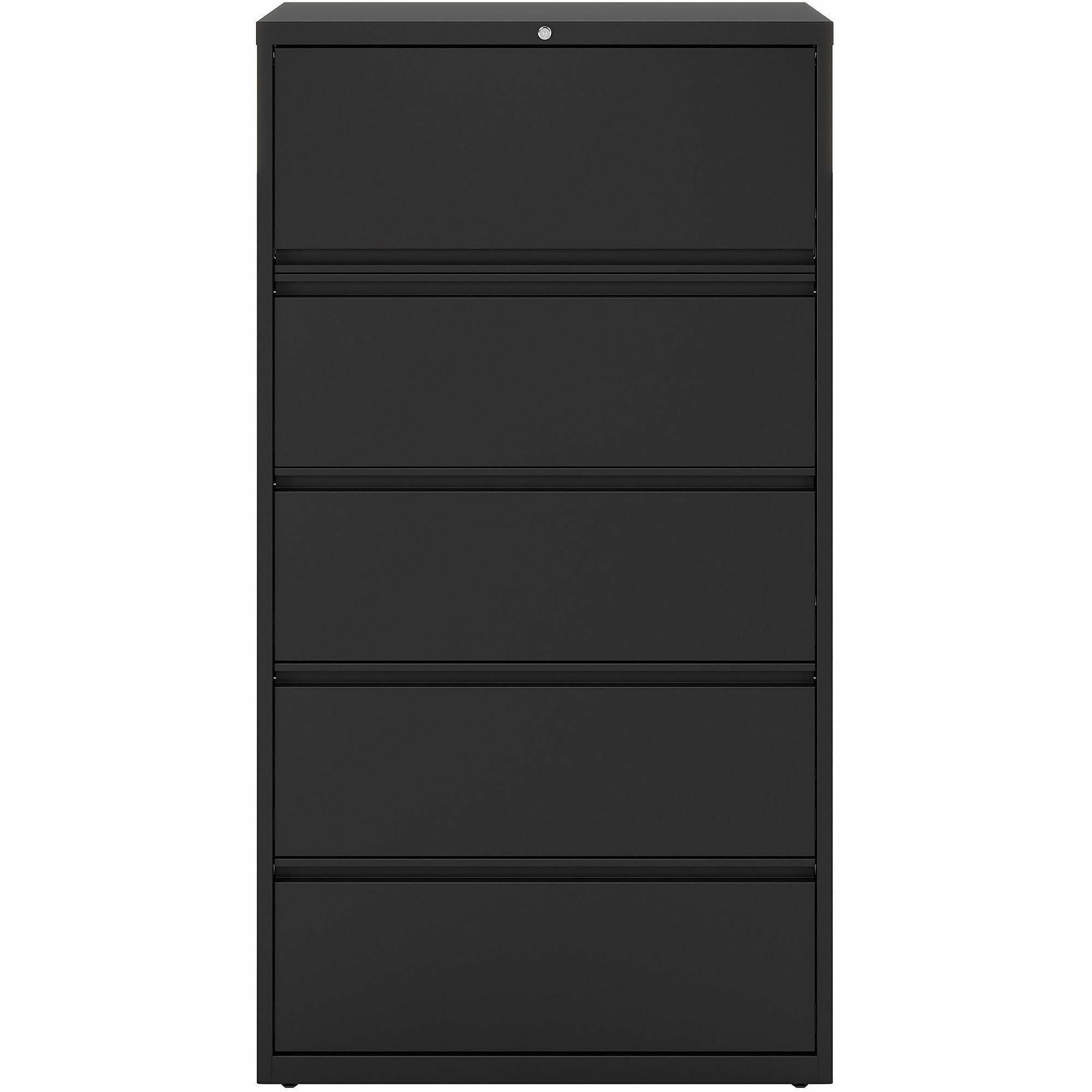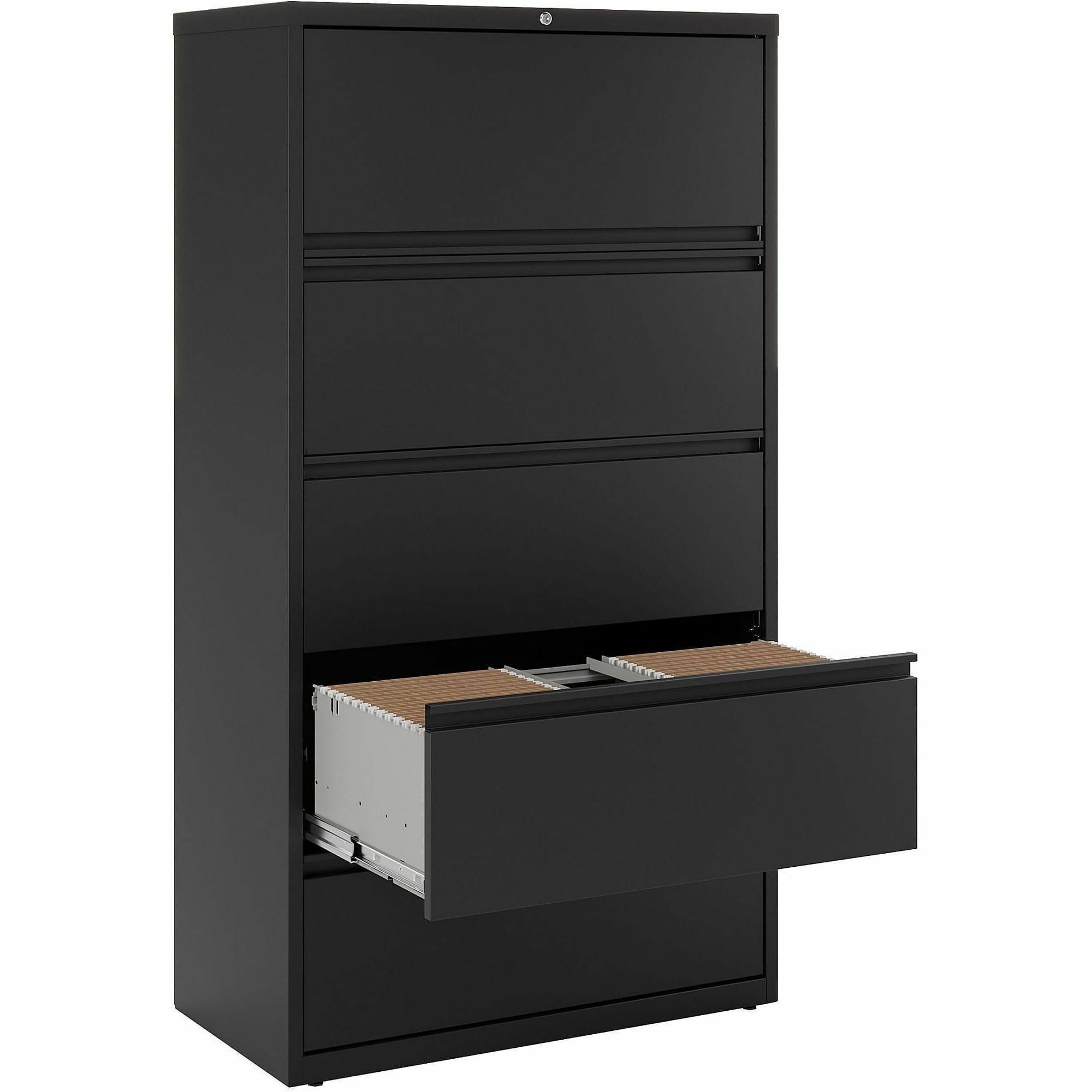 | Product Description | 36" wide lateral file features five drawers with hanging file rails for side-to-side filing in letter-size, legal-size or A4-size for versatility. Each drawer has a magnetic label holder for easy identification where you need it. Durable, fully assembled steel construction with nonporous surface is easy to clean and disinfect. Design also features a core-removable lock for security, dual locking bars, full-width pull, ball-bearing slide suspension for smooth opening and closing, reinforced base, and four adjustable leveling guides for stabilization. Interlock system prohibits the extension of more than one drawer at a time for your safety. Counterweight prevents tipping. Lateral file meets or exceeds applicable ANSI/BIFMA standards. |
