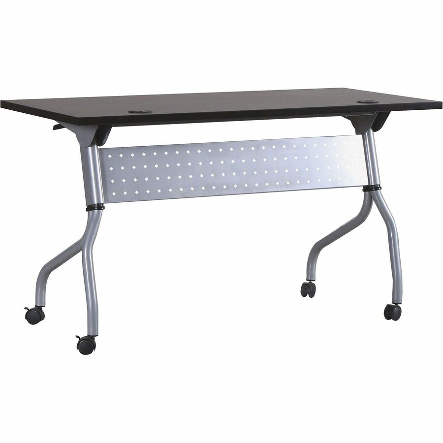| Product Description | Part of the Lorell Preference Series, this versatile training table offers flexible configurations and convenient storage. Use individually or secure together into rows with a reliable metal connector (sold separately). Espresso top flips up for easy storage without having to remove the connector. Top features a melamine surface with a 3mm PVC straight edge. Two grommets allow easy cord management. Four-leg, all-metal silver base features a one-way fold and modesty panel. Table rolls easily on four nylon casters with brakes. |