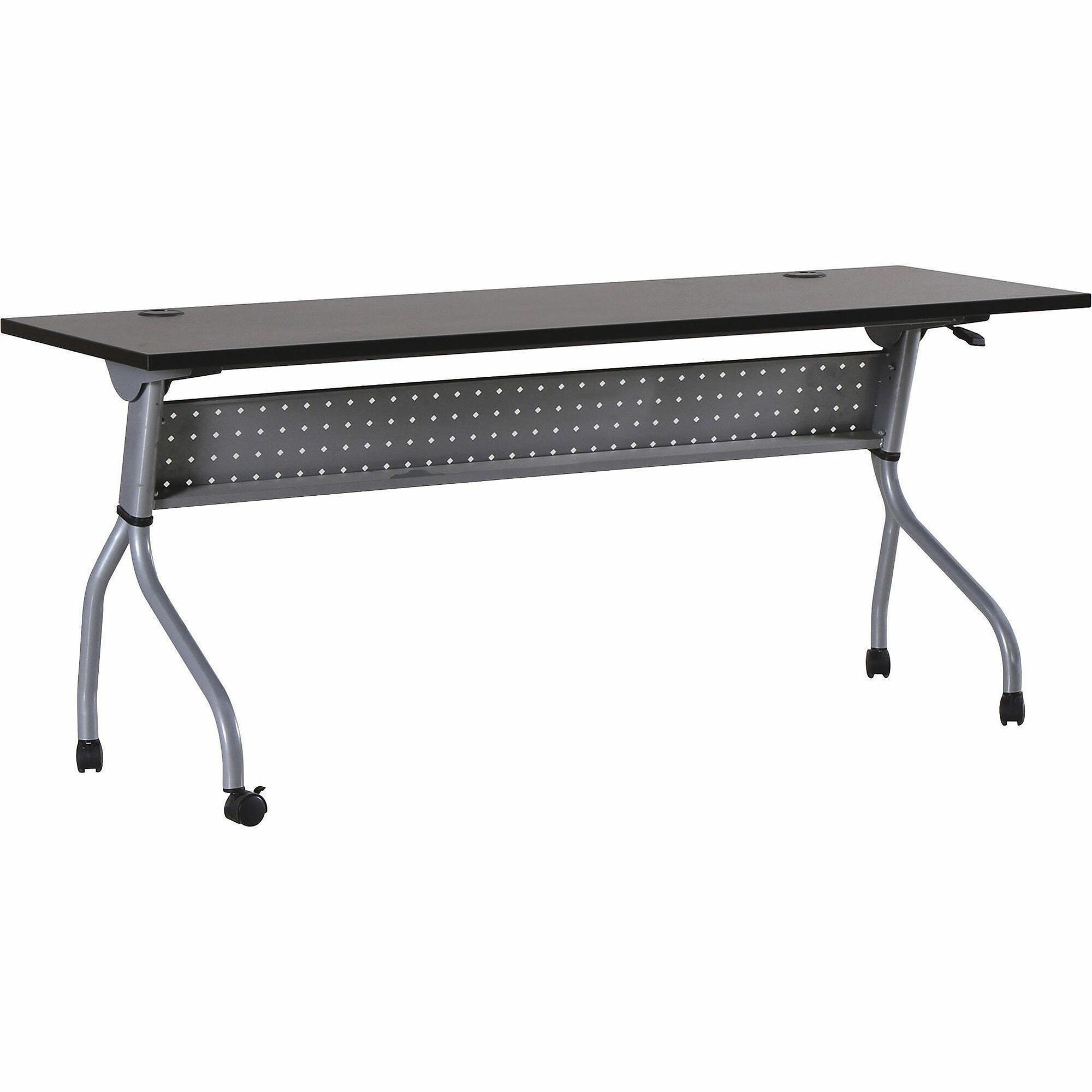 | Product Description | Part of the Lorell Preference Series, this versatile training table offers flexible configurations and convenient storage. Use individually or secure together into rows with a reliable metal connector (sold separately). Espresso top flips up for easy storage without having to remove the connector. Top features a melamine surface with a 3mm PVC straight edge. Two grommets allow easy cord management. Four-leg, all-metal silver base features a one-way fold and modesty panel. Table rolls easily on four nylon casters with brakes. |