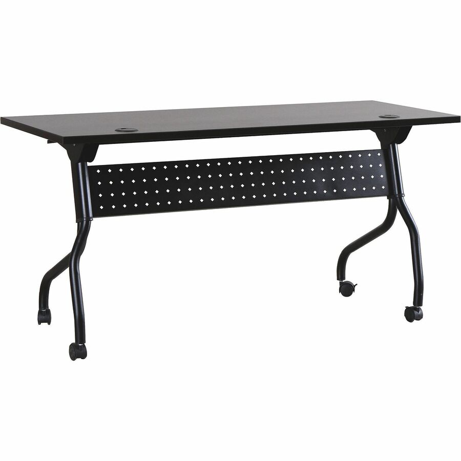 | Product Description | Part of the Lorell Preference Series, this versatile training table offers flexible configurations and convenient storage. Use individually or secure together into rows with a reliable metal connector (sold separately). Espresso top flips up for easy storage without having to remove the connector. Top features a melamine surface with a 3mm PVC straight edge. Two grommets allow easy cord management. Four-leg, all-metal black base features a one-way fold and modesty panel. Table rolls easily on four nylon casters with brakes. |