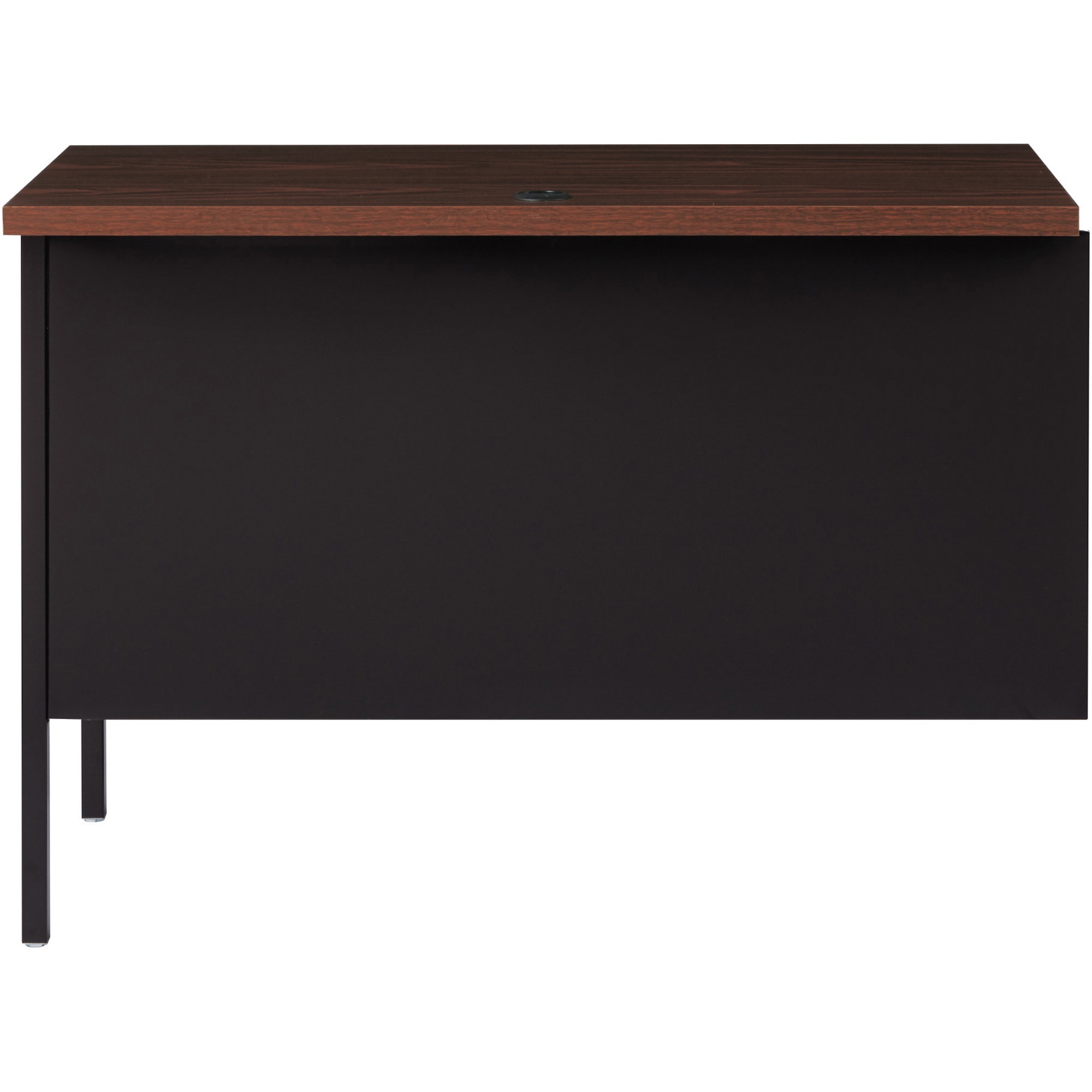 | Product Description | Right-pedestal return is part of the Lorell Fortress Series, a practical and professional desk solution ideal for business, government and educational offices. Use this right-pedestal return with a Fortress left-pedestal desk for L-shaped configurations. Both have 3/4-height modesty panels for seamless lines. Durable, high-performance steel construction stands up to rigorous daily use. The 1-1/8" thick top with square edges features a Walnut laminate surface that is scratch-resistant, stain-resistant and water-resistant. Design also features a box/file pedestal on the right. Both drawers offer full-extension, ball-bearing slides and full-width, integrated drawer pulls. File drawer accommodates letter-size files. Center grommet allows easy cord management. Reinforced, double-frame inner structure keeps desk solid and sturdy for years of use. Steel return in black meets or exceeds ANSI/BIFMA standards. |