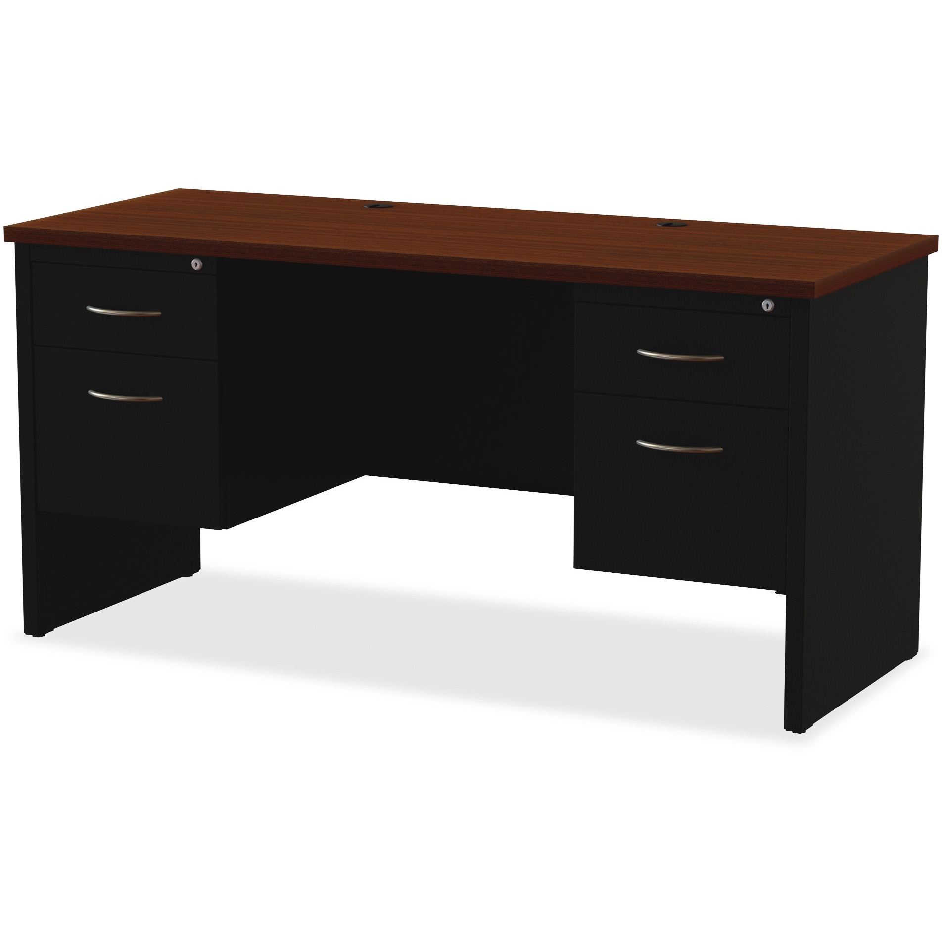 60" Width x 24" Depth, x 1.1" Thickness Top - Total Drawer(s): 2 - Double Pedestal - Material: Steel - Finish: Walnut Laminate, Black - Scratch Resistant, Stain Resistant, Ball-bearing Suspension, Grommet, Handle, Cord Management, Adjustable Glide - 1 Each