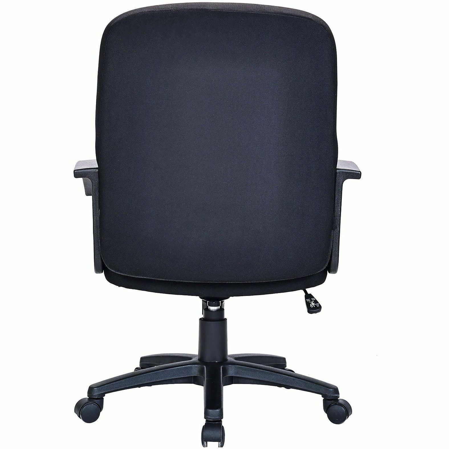 | Product Description | Executive mid-back chair is a fully upholstered with black fabric and 3" thick back cushion for comfortable seating while you work. Black frame offers stylish, fixed, nylon open-loop arms and a five-star nylon base with dual-wheel hard casters for easy mobility. Functions include pneumatic seat-height adjustment, 360-degree swivel, tilt, tilt tension and tilt lock. With the tilt functions, you can easily lean the chair back or lock out the tilt function when the chair is in the upright position. Weight capacity is 275 lb. Seat size is 20-1/2" wide x 20" deep. Back dimensions are 20" wide x 25-1/2" high. |