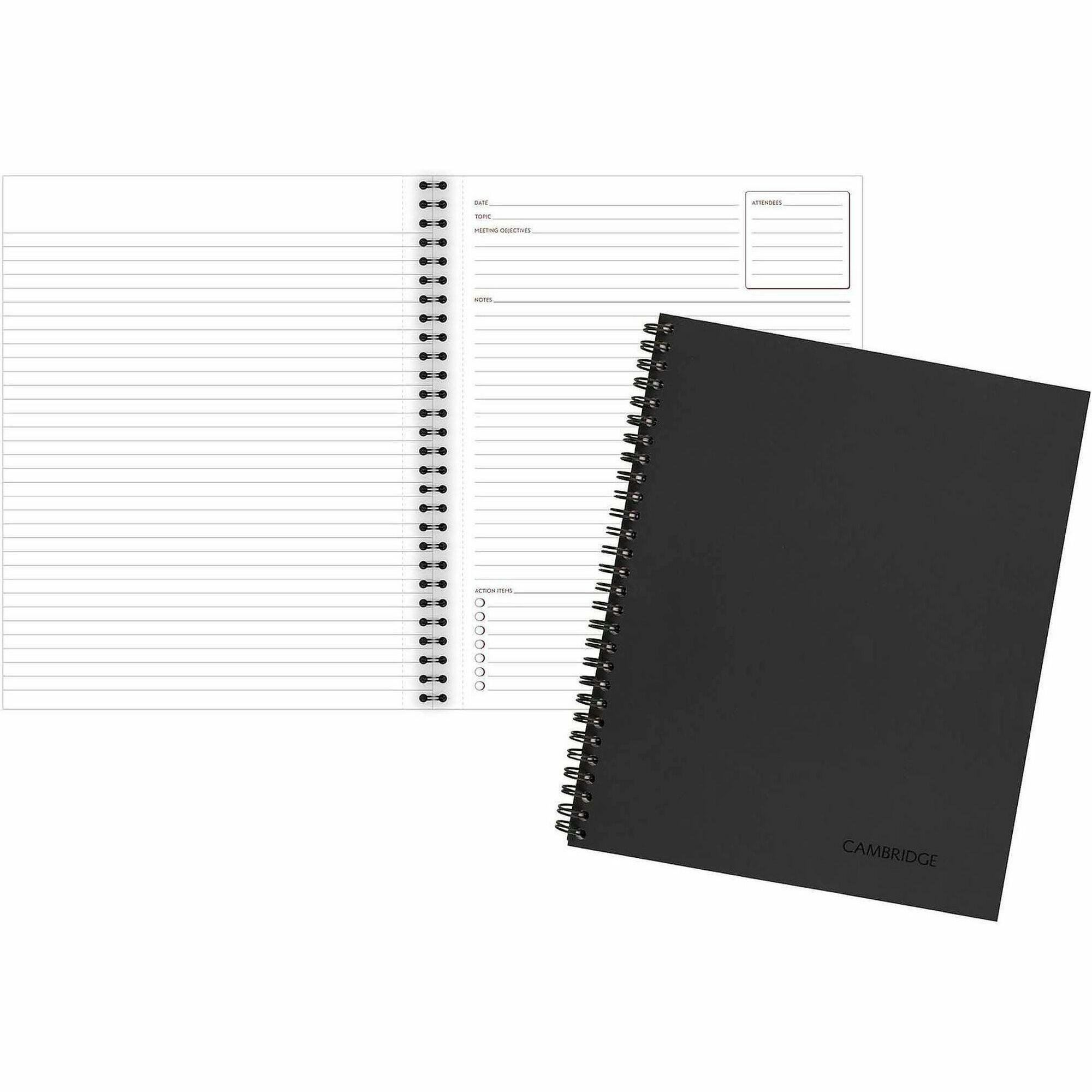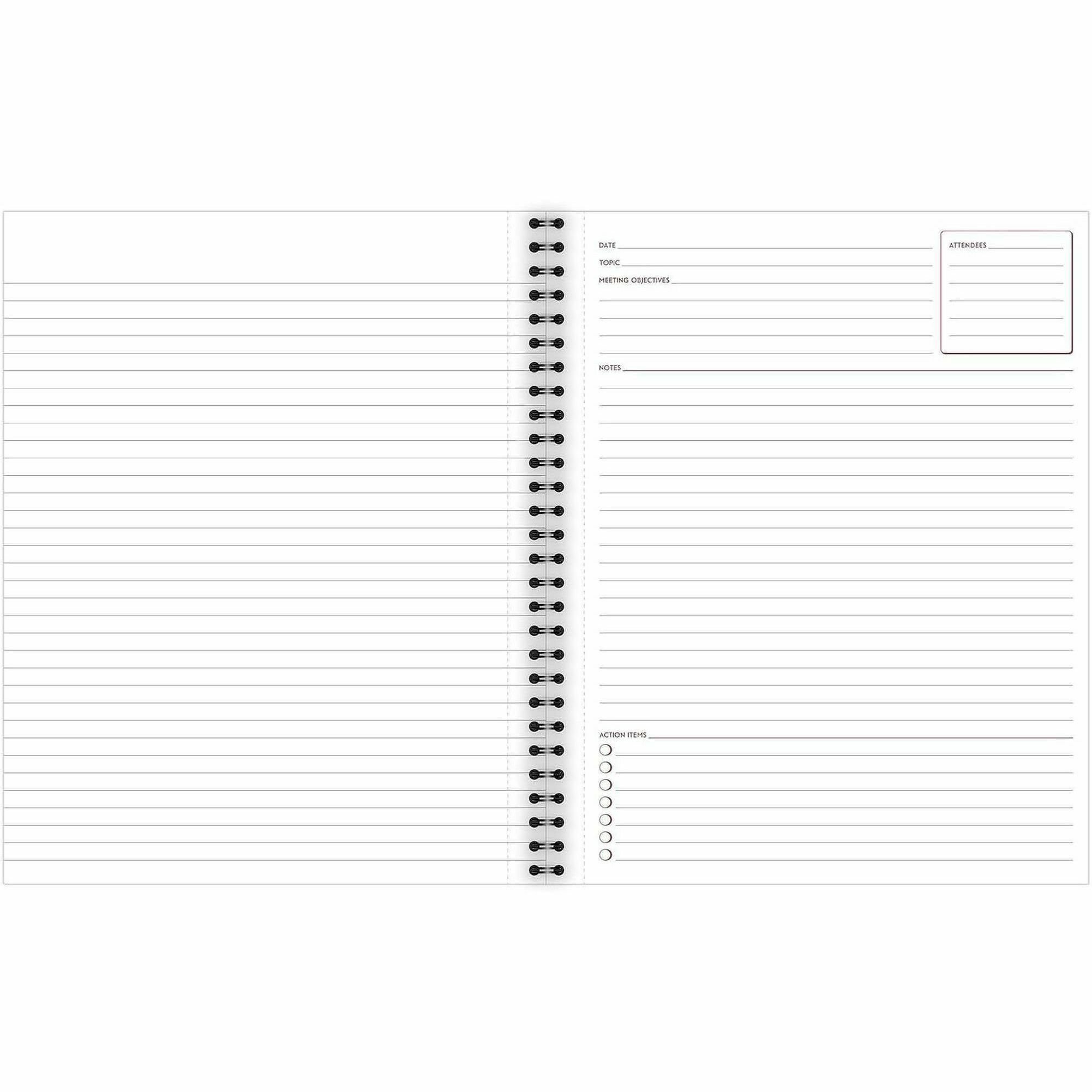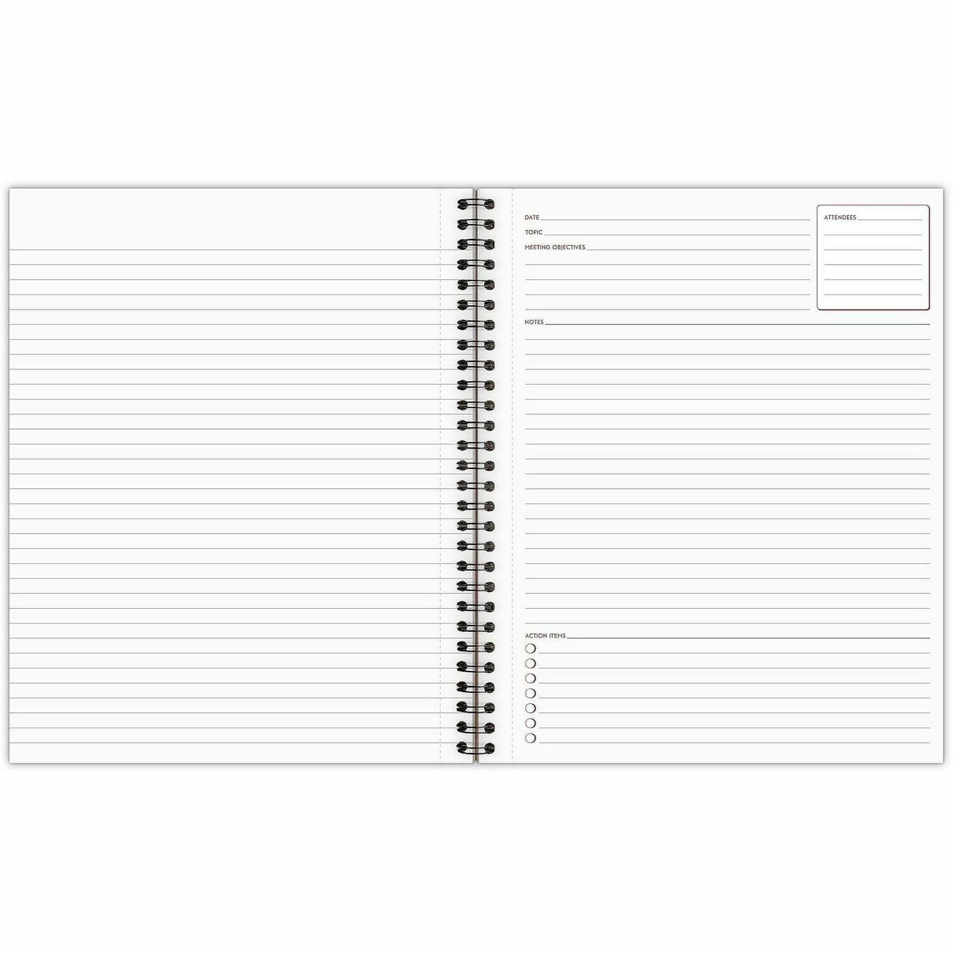 | Product Description | Meeting notebook helps you organize all your meeting notes. Layout includes sections for Attendees, Notes and Action Items. Linen cover has black wire binding. Meeting notebook contains 80 sheets of ruled, premium bond paper with a no-bleed writing surface. Pages are perforated. |