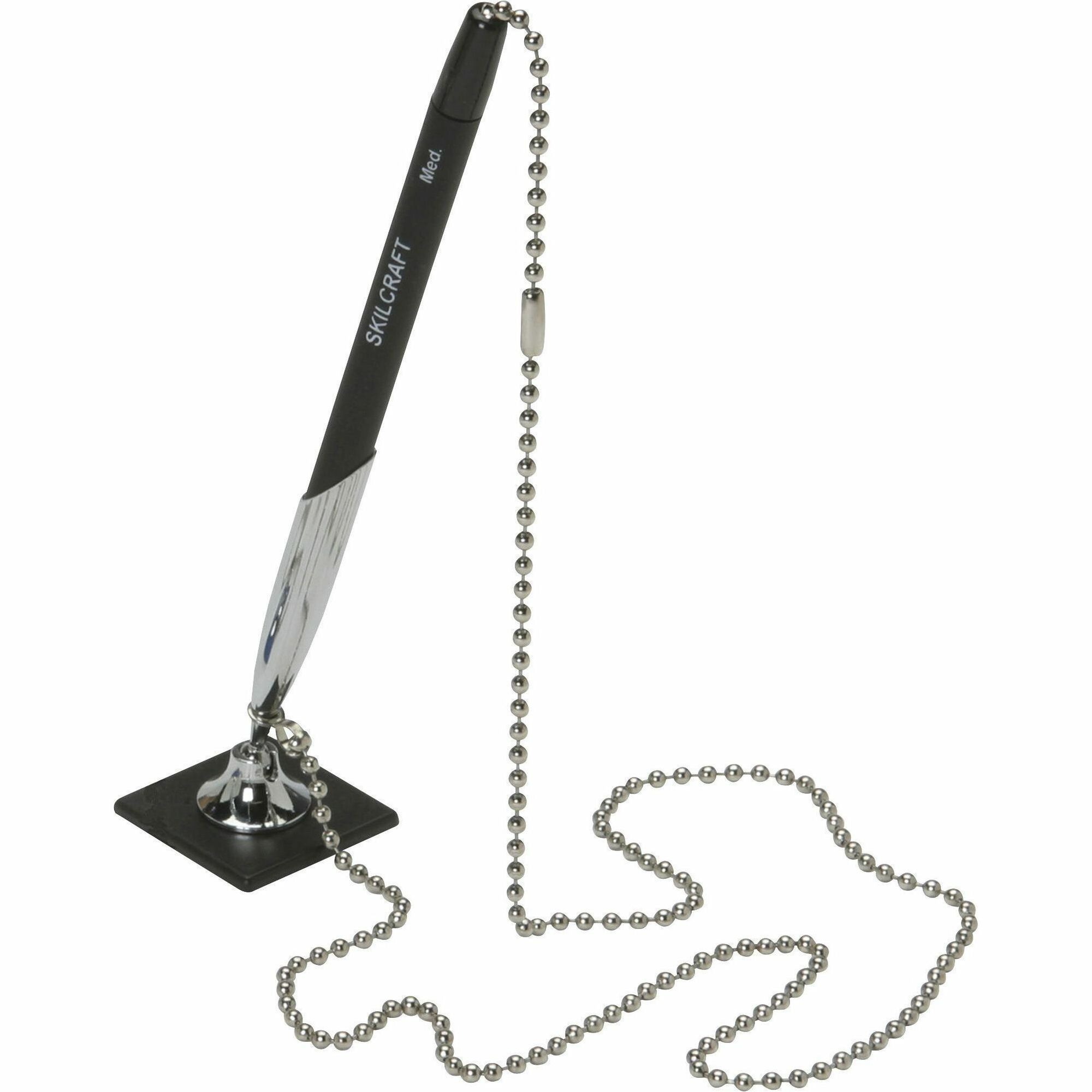 Ballpoint chain pen features a rubberized barrel with a grooved grip for writing comfort. Upright holder swivels 360 degrees. Adhesive base attaches to any surface. A 24" steel-ball chain attaches to the pen and base to prevent loss. Base and barrel match ink color. Ballpoint pen ink is permanent, long-lasting, airplane-safe and highly reliable. Use ballpoint pen to write on nearly all types of paper. |