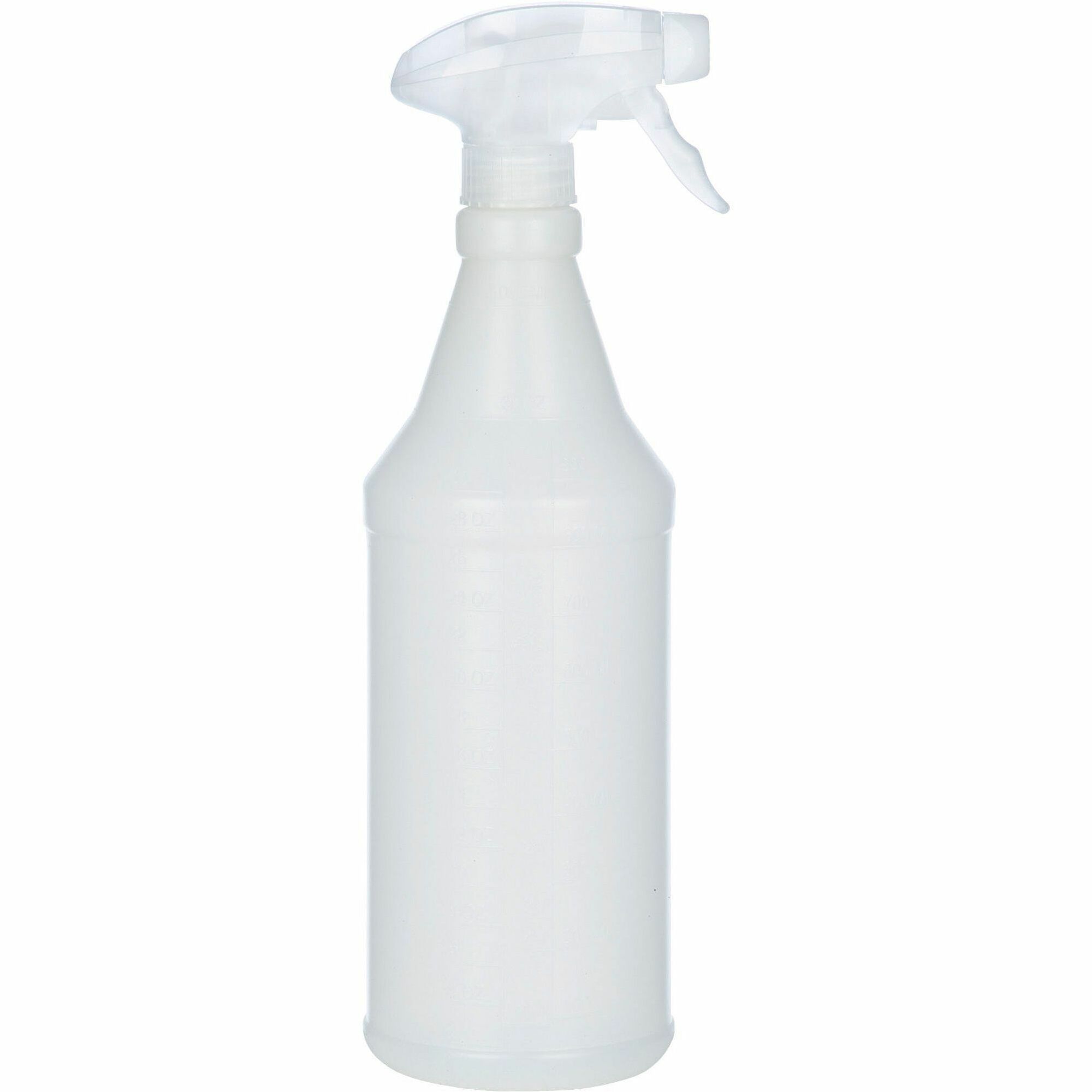 Empty, plastic spray bottle features a trigger-type atomizer cap and flexible plastic tube that is ideal for dispensing cleaners. Chemical-resistant trigger sprayer is adjustable. Bottle is marked with ounce gradations. Bottle is made of 100 percent recyclable plastic with 50 percent post-consumer recycled material. |