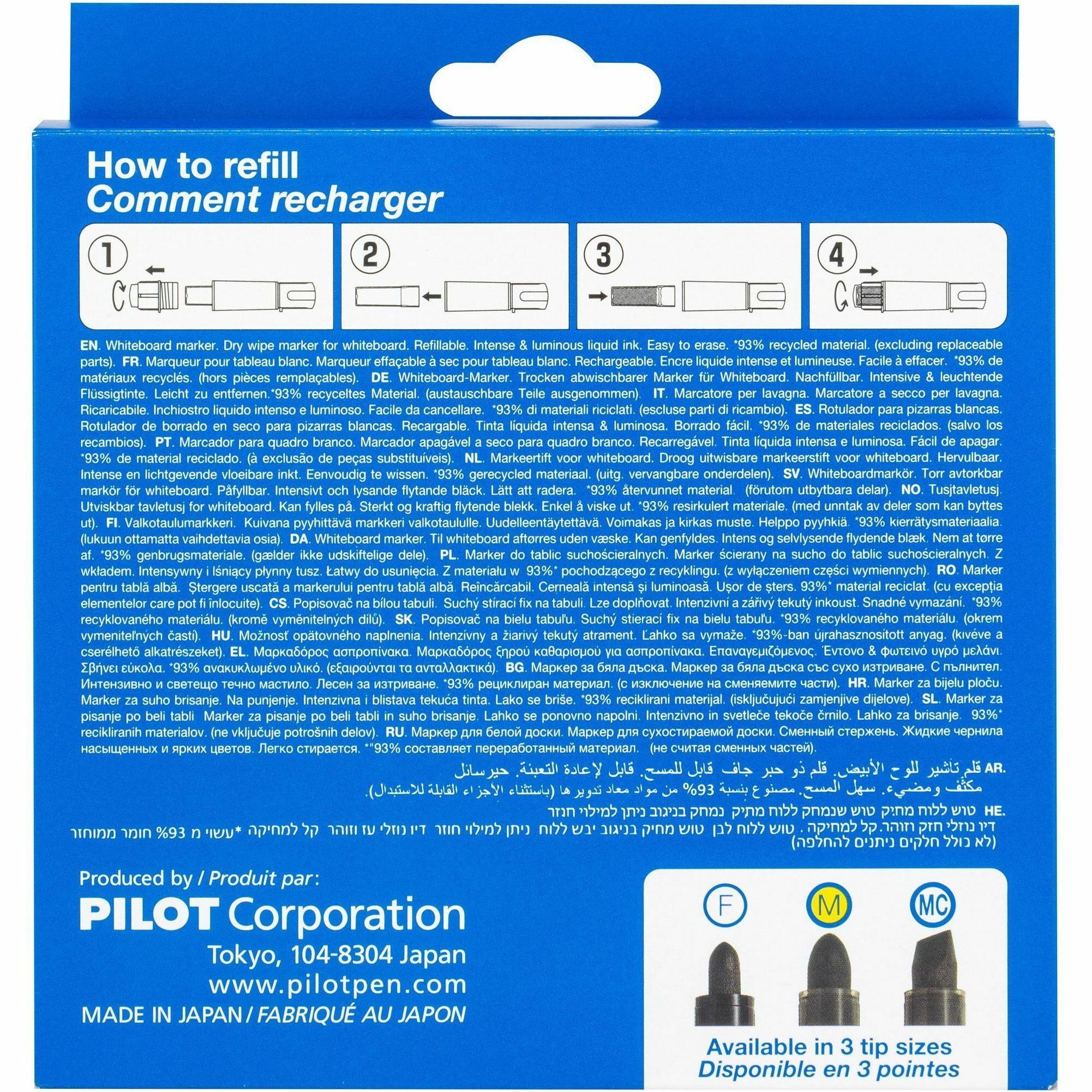 | Product Description | Dry-erase markers with bullet tip are made from a high percentage of recycled material and meets ISO 14001 and 14021 Standards. Innovative Twin Pipe Feed system ensures smooth and steady ink flow. Visible, long-lasting ink supply delivers vibrant colors. Vivid, dense writing is clearly visible from a distance. Refill with Pilot V Board Master refills for continued use. Bullet pouch of markers offers an assortment of colors. |