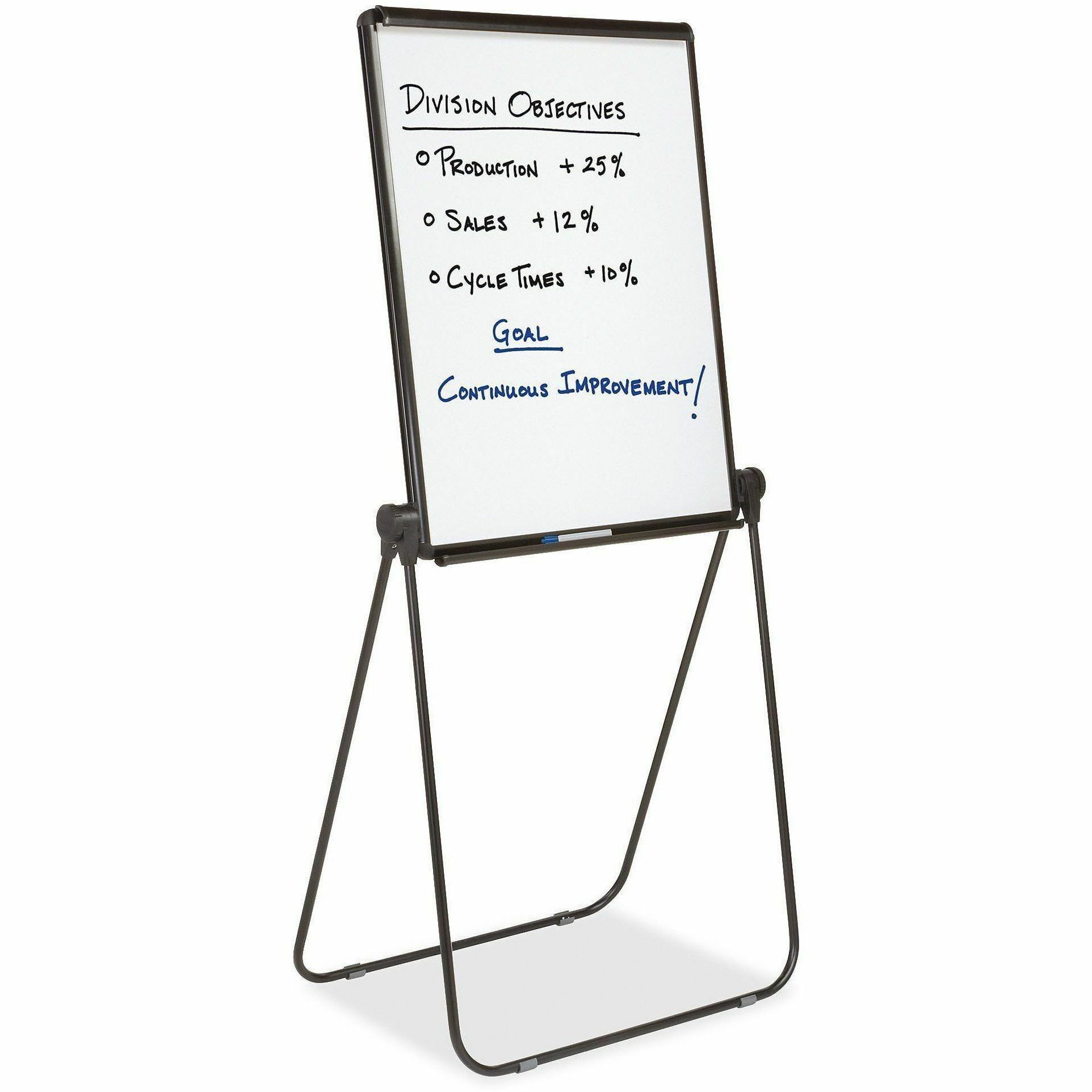 | Product Description | Versatile, sturdy easel is ideal for floor or tabletop use. Height and angle easily adjust from 39" to 70" for viewing, presenting and preparing flip charts. Adjustable angle of board can be positioned as a drafting table. The included, spring-loaded, flip chart holder accepts a standard easel pad (one side only) for paper notes. Melamine, dry-erase surface (27" wide x 34" high) features an aluminum frame and provides reusable convenience. Lightweight easel also has steel legs. |