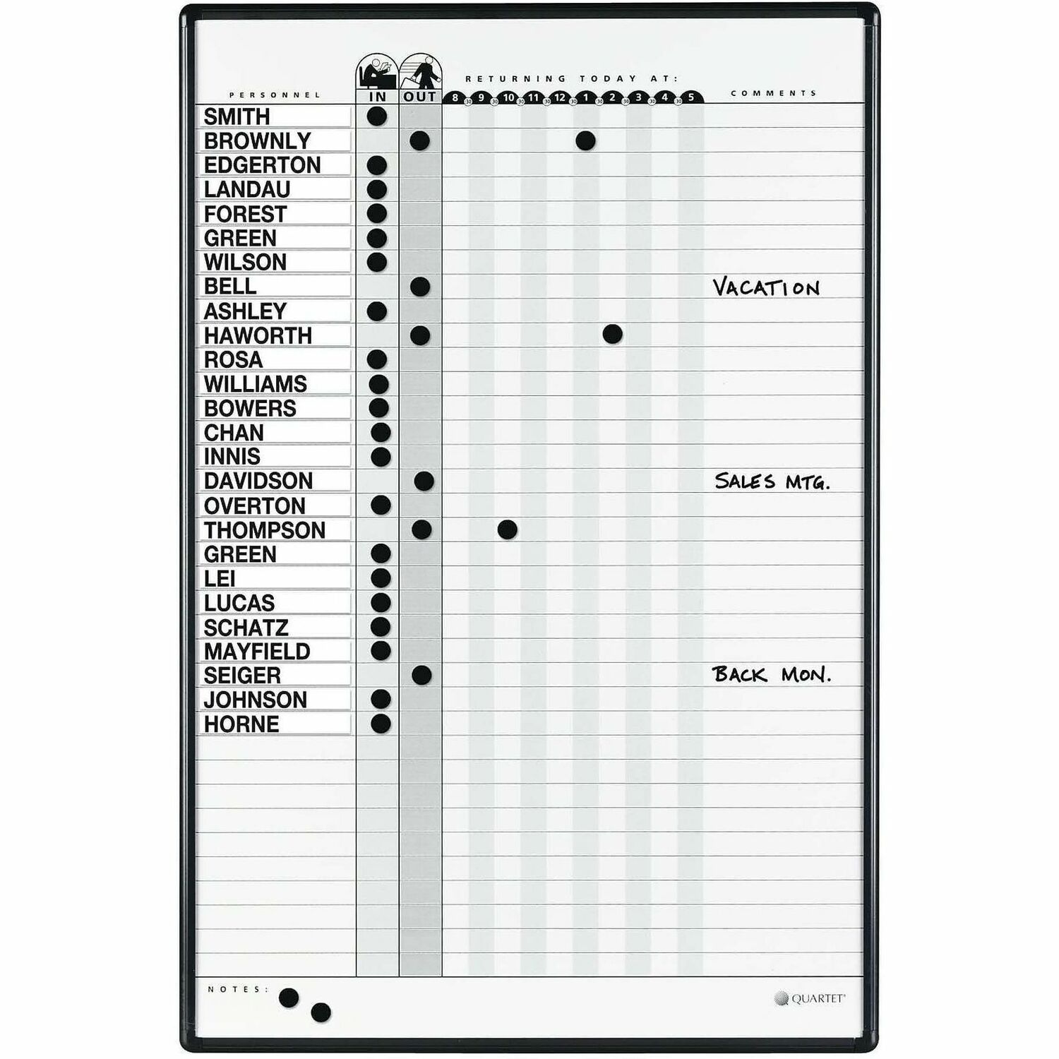 | Product Description | Magnetic In/Out Board uses magnetic dots to show in/out status and return time. Features gray porcelain-on-steel surface. Board includes self-stick vinyl characters, name strips, magnetic strips for remarks, a water-soluble black marker and magnetic circle indicators. |